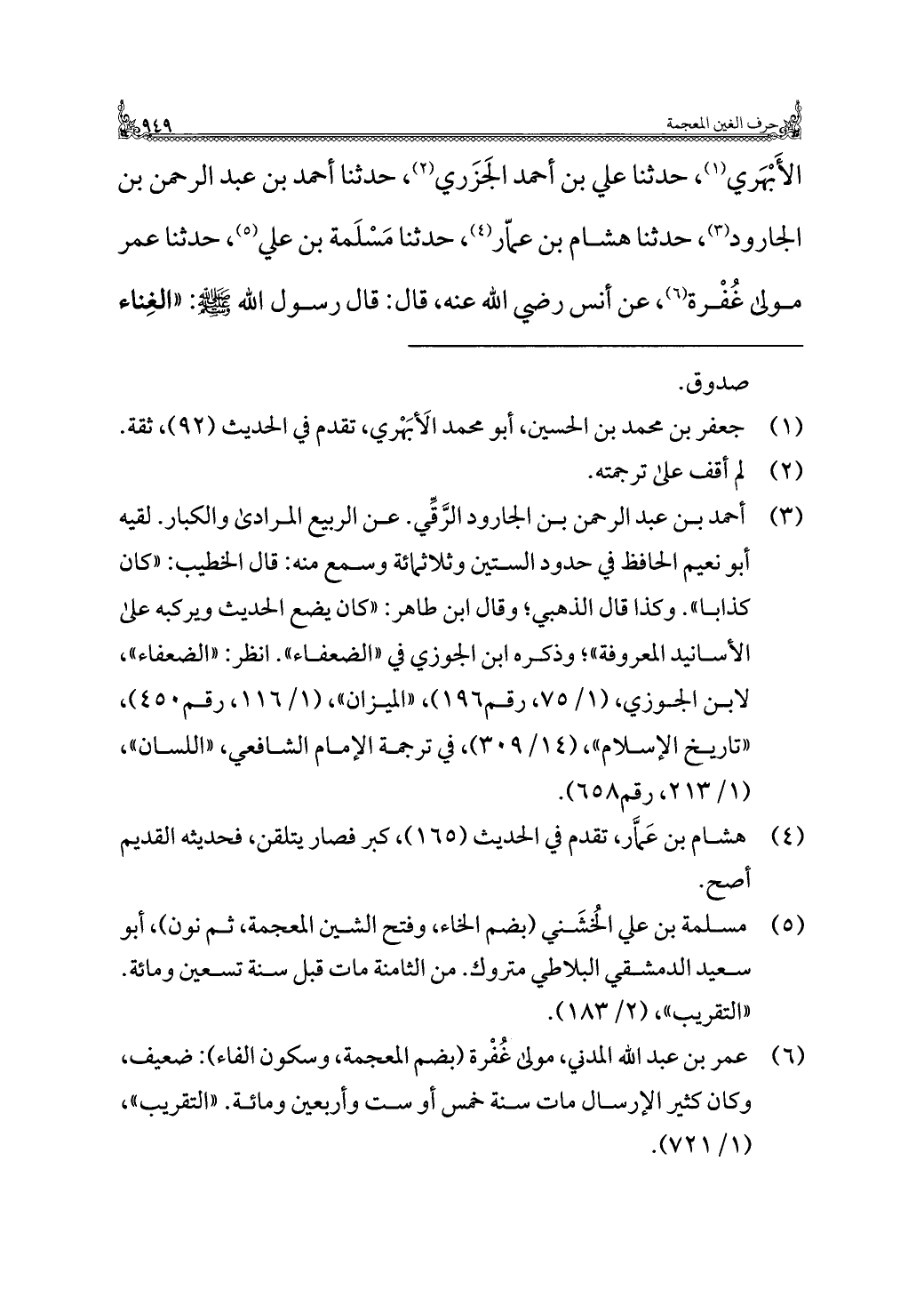الأَبْهَري (¬١)، حدثنا علي بن أحمد الجَزَري (¬٢)، حدثنا أحمد بن عبد الرحمن بن الجارود (¬٣)، حدثنا هشام بن عماّر (¬٤)، حدثنا مَسْلَمة بن علي (¬٥)، حدثنا عمر مولى غُفْرة (¬٦)، عن أنس رضي الله عنه، قال: قال رسول الله -صلى الله عليه وسلم-: "الغِناء