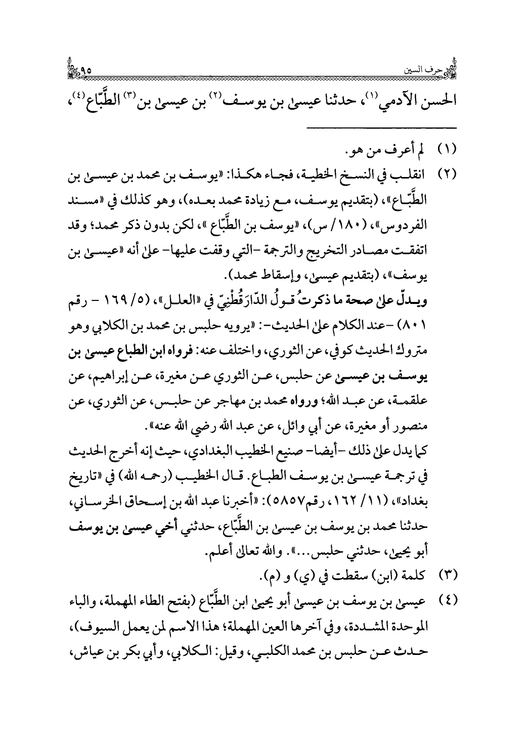 كما يدل على ذلك -أيضًا- صنيع الخطيب البغدادي، حيث إنه أخرج الحديث في ترجمة عيسى بن يوسف الطباع. قال الخطيب (رحمه اللَّه) في "تاريخ بغداد"، (١١/ ١٦٢، رقم ٥٨٥٧): "أخبرنا عبد اللَّه بن إسحاق الخرساني، حدثنا محمد بن يوسف بن عيسى بن الطَّبّاع، حدثني أخي عيسى بن يوسف أبو يحيى، حدثني حلبس. . . ". واللَّه تعالى أعلم.