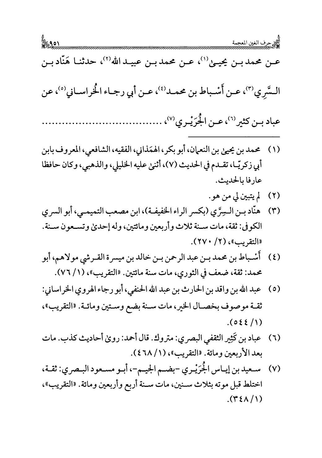 عن محمد بن يحيى (¬١)، عن محمد بن عبيد الله (¬٢)، حدثنا هَنّاد بن السَّرِي (¬٣)، عن أَسْباط بن محمد (¬٤)، عن أبي رجاء الخُراساني (¬٥)، عن عباد بن كثير (¬٦)، عن الجُرَيْري (¬٧)، ....................................
