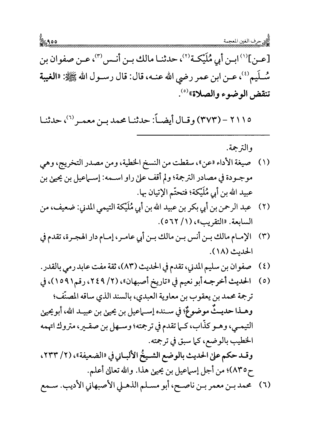 [عن] (¬١) ابن أبي مُلَيْكة (¬٢)، حدثنا مالك بن أنس (¬٣)، عن صفوان بن سُلَيم (¬٤)، عن ابن عمر رضي الله عنه، قال: قال رسول الله -صلى الله عليه وسلم-: "الغيبة تنقض الوضوء والصلاة" (¬٥).