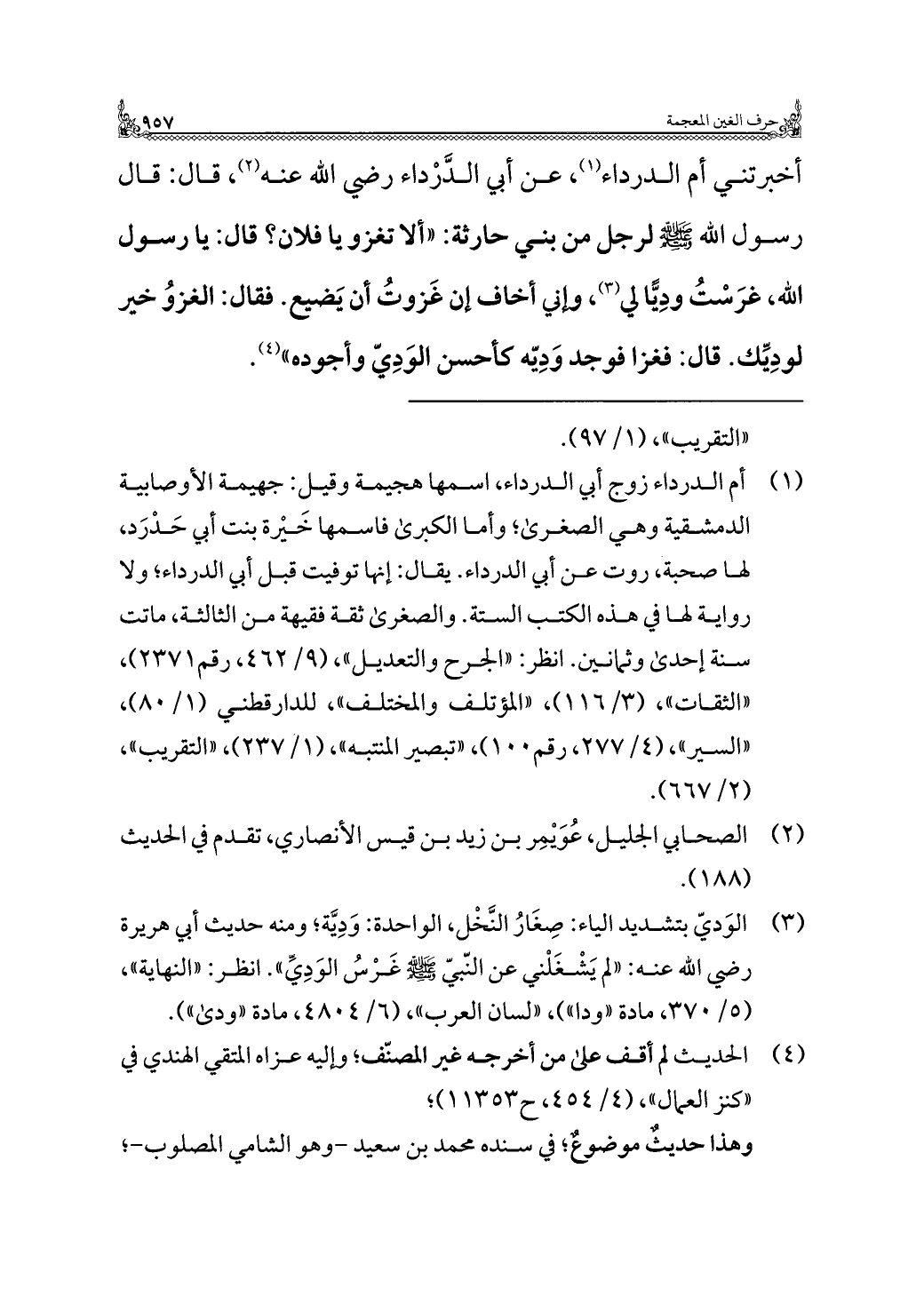 أخبرتني أم الدرداء (¬١)، عن أبي الدَّرْداء رضي الله عنه (¬٢)، قال: قال رسول الله -صلى الله عليه وسلم- لرجل من بني حارثة: "ألا تغزو يا فلان؟ قال: يا رسول الله، غرَسْتُ ودِيًّا لي (¬٣)، وإني أخاف إن غَزوتُ أن يَضيع. فقال: الغزوُ خير لودِيِّك. قال: فغزا فوجد وَدِيّه كأحسن الوَدِيّ وأجوده" (¬٤).