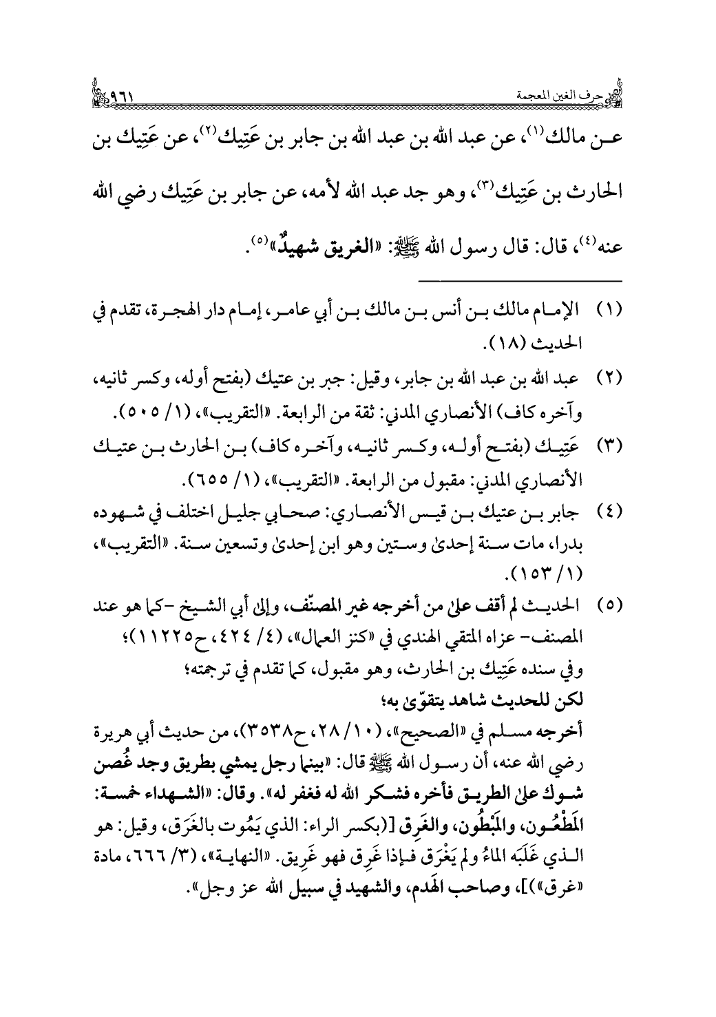 عن مالك (¬١)، عن عبد الله بن عبد الله بن جابر بن عَتِيك (¬٢)، عن عَتِيك بن الحارث بن عَتِيك (¬٣)، وهو جد عبد الله لأمه، عن جابر بن عَتِيك رضي الله عنه (¬٤)، قال: قال رسول الله -صلى الله عليه وسلم-: "الغريق شهيدٌ" (¬٥).