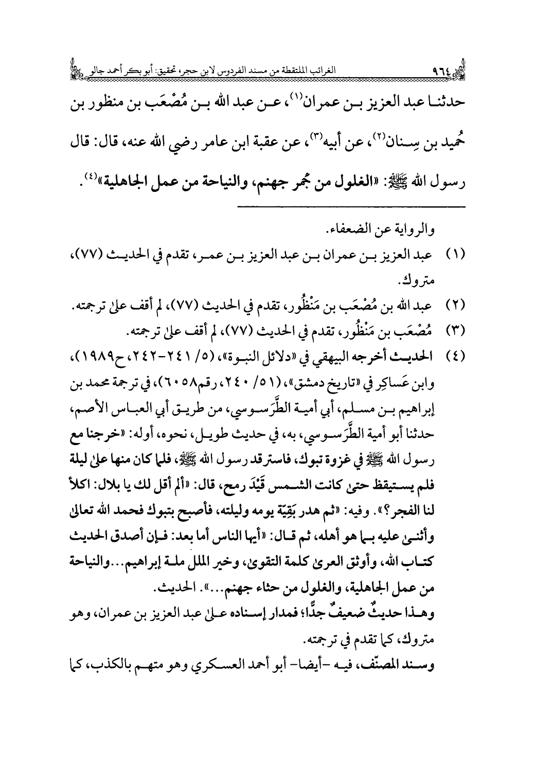 حدثنا عبد العزيز بن عمران (¬١)، عن عبد الله بن مُصْعَب بن منظور بن حُميد بن سِنان (¬٢)، عن أبيه (¬٣)، عن عقبة ابن عامر رضي الله عنه، قال: قال رسول الله -صلى الله عليه وسلم-: "الغلول من جمر جهنم، والنياحة من عمل الجاهلية" (¬٤).