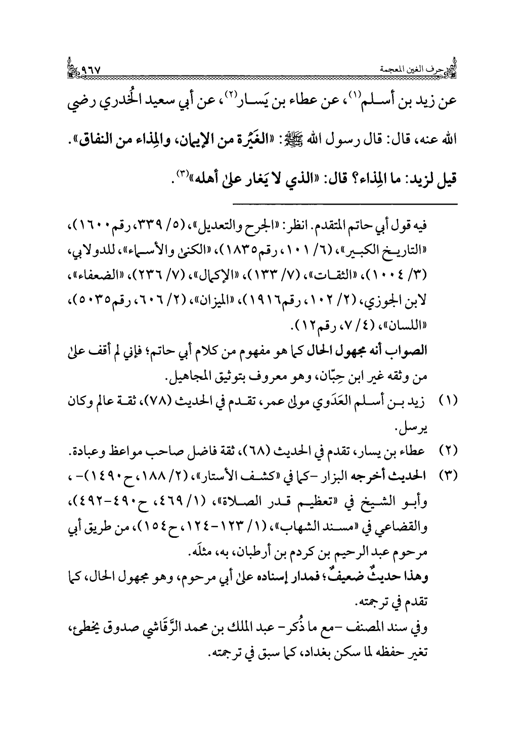 عن زيد بن أسلم (¬١)، عن عطاء بن يَسار (¬٢)، عن أبي سعيد الخُدري رضي الله عنه، قال: قال رسول الله -صلى الله عليه وسلم-: "الغَيرة من الإيمان، والمِذاء من النفاق". قيل لزيد: ما المِذاء؟ قال: "الذي لا يَغار على أهله" (¬٣).
