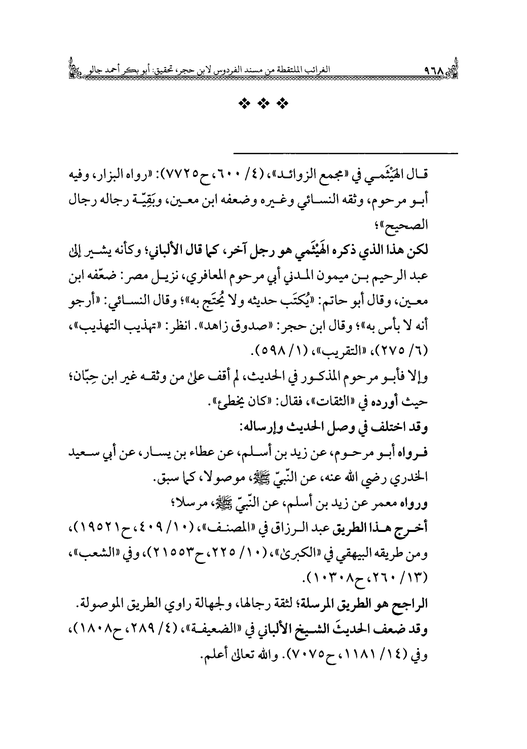 فرواه أبو مرحوم، عن زيد بن أسلم، عن عطاء بن يسار، عن أبي سعيد الخدري رضي الله عنه، عن النّبيّ -صلى الله عليه وسلم-، موصولا، كما سبق.