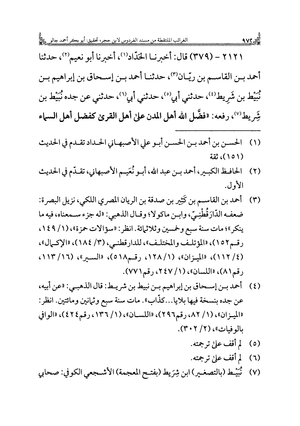٢١٢١ - (٣٧٩) قال: أخبرنا الحَدّاد (¬١)، أخبرنا أبو نعيم (¬٢)، حدثنا أحمد بن القاسم بن ريّان (¬٣)، حدثنا أحمد بن إسحاق بن إبراهيم بن نُبَيْط بن شَرِيط (¬٤)، حدثني أبي (¬٥)، حدثني أبي (¬٦)، حدثني عن جده نُبَيْط بن شِريط (¬٧)، رفعه: "فضَّل الله أهل المدن على أهل القرى كفضل أهل السماء