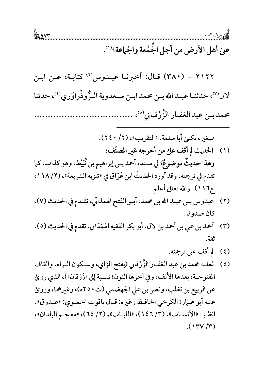 ٢١٢٢ - (٣٨٠) قال: أخبرنا عبدوس (¬٢) كتابة، عن ابن لال (¬٣)، حدثنا عبد الله بن محمد ابن سعدوية الرُّوذْراوَري (¬٤)، حدثنا محمد بن عبد الغفار الزَّرْقاني (¬٥)، ....................................