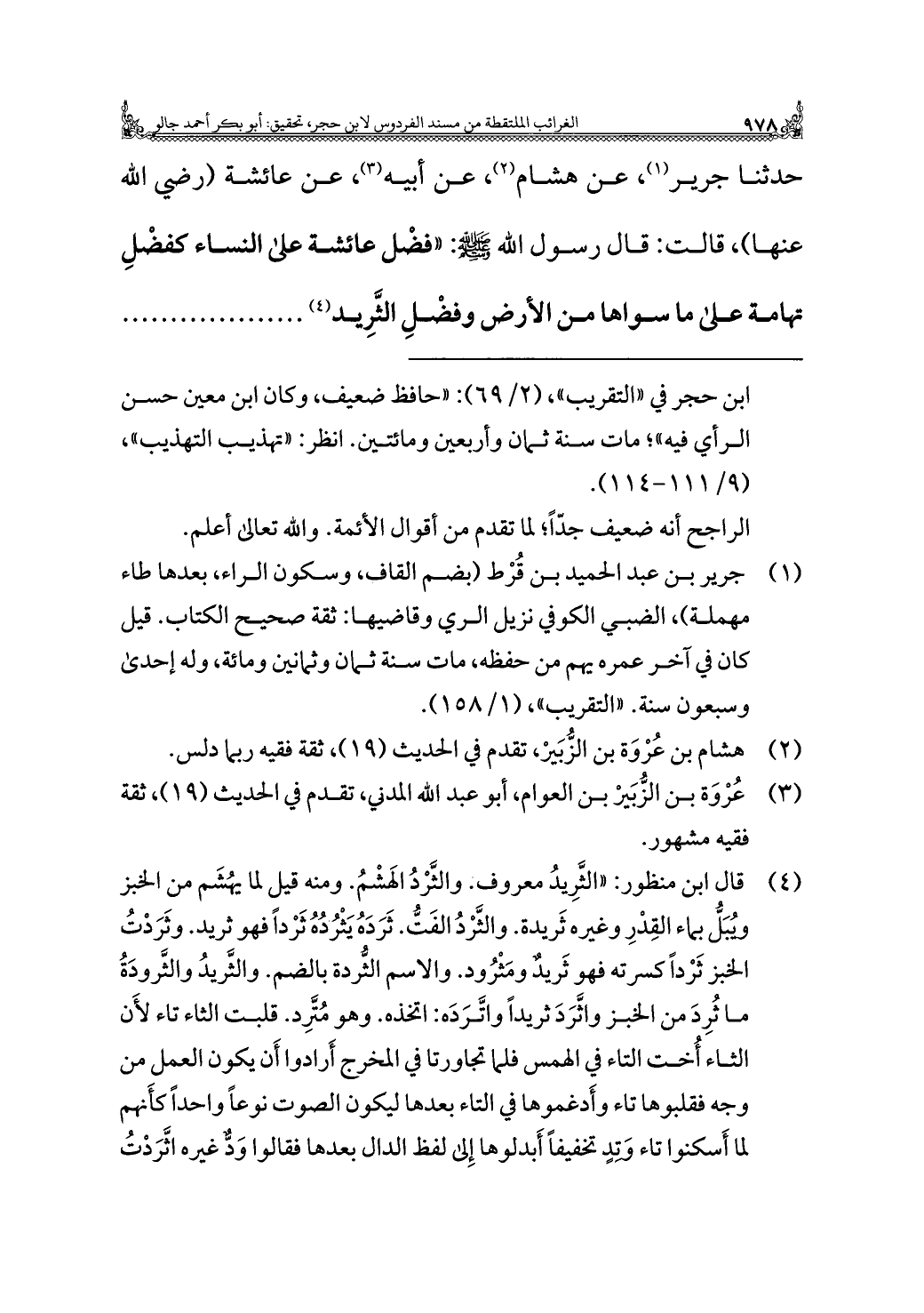 حدثنا جرير (¬١)، عن هشام (¬٢)، عن أبيه (¬٣)، عن عائشة (رضي الله عنها)، قالت: قال رسول الله -صلى الله عليه وسلم-: "فضْل عائشة على النساء كفضْلِ تهامة على ما سواها من الأرض وفضْلِ الثَّرِيد (¬٤) ...................