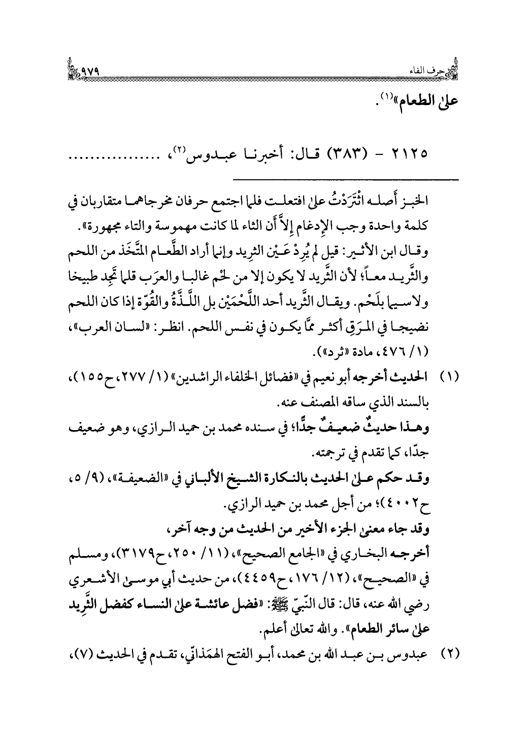 الخبز أَصله اثْتَرَدْتُ على افتعلت فلما اجتمع حرفان مخرجاهما متقاربان في كلمة واحدة وجب الإِدغام إلَّا أَن الثاء لما كانت مهموسة والتاء مجهورة". وقال ابن الأثير: قيل لم يُرِدْ عَيْن الثرِيد وإنما أراد الطَّعام المتَّخَذ من اللحم والثَّريد معًا؛ لأن الثَّريد لا يكون إلا من لحْم غالبا والعرَب قلما تَجِد طبيخا ولاسيما بلَحْم. ويقال الثَّريد أحد اللَّحْمَيْن بل اللَّذَّةُ والقُوّة إذا كان اللحم نضيجا في المرَقِ أكثر ممَّا يكون في نفس اللحم. انظر: "لسان العرب"، (١/ ٤٧٦، مادة "ثرد").
