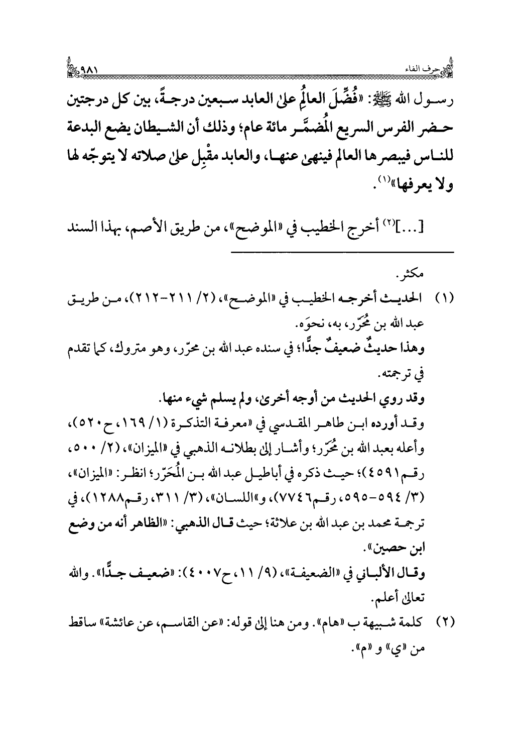 رسول الله -صلى الله عليه وسلم-: "فُضِّلَ العالِمُ على العابد سبعين درجةً، بين كل درجتين حضر الفرس السريع المُضمَّر مائة عام؛ وذلك أن الشيطان يضع البدعة للناس فيبصرها العالم فينهى عنها، والعابد مقْبِل على صلاته لا يتوجّه لها ولا يعرفها" (¬١).