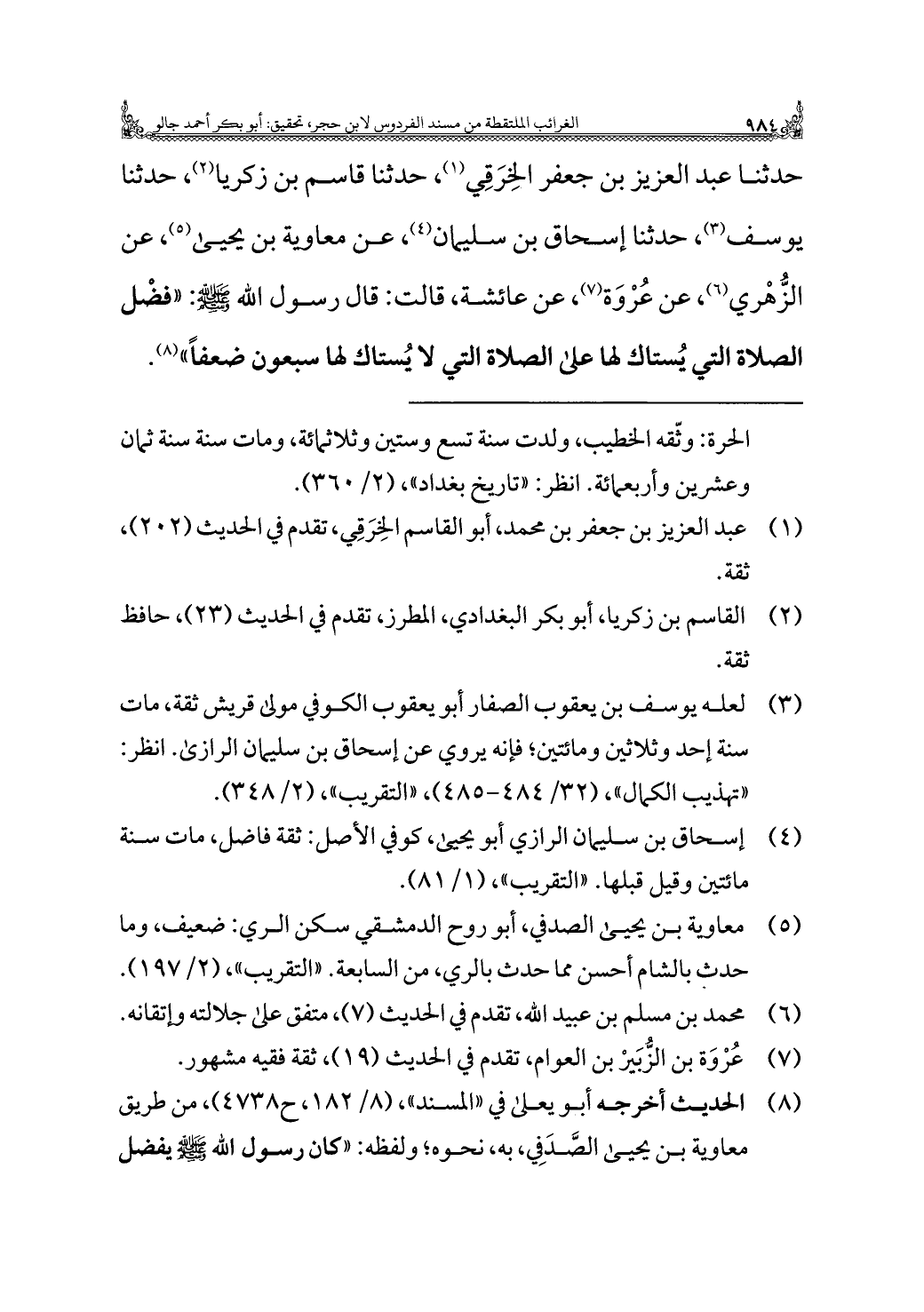 حدثنا عبد العزيز بن جعفر الخِرَقِي (¬١)، حدثنا قاسم بن زكريا (¬٢)، حدثنا يوسف (¬٣)، حدثنا إسحاق بن سليمان (¬٤)، عن معاوية بن يحيى (¬٥)، عن الزُّهْري (¬٦)، عن عُرْوَة (¬٧)، عن عائشة، قالت: قال رسول الله -صلى الله عليه وسلم-: "فضْل الصلاة التي يُستاك لها على الصلاة التي لا يُستاك لها سبعون ضعفًا" (¬٨).