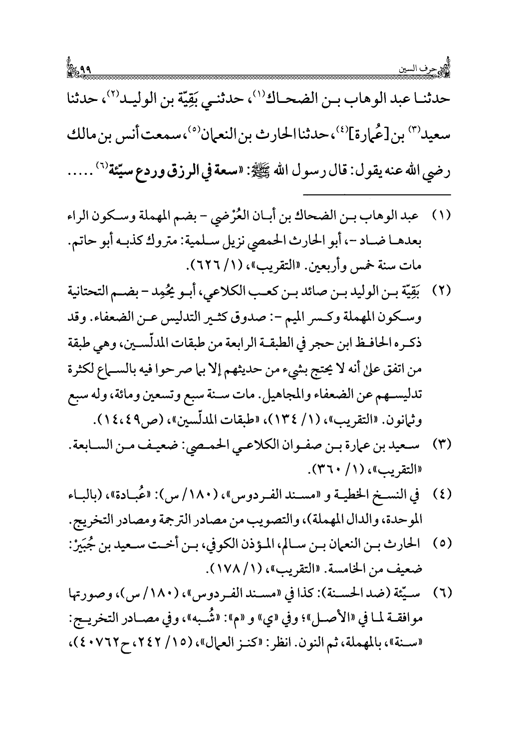 حدثنا عبد الوهاب بن الضحاك (¬١)، حدثني بَقِيّة بن الوليد (¬٢)، حدثنا سعيد (¬٣) بن [عُمارة] (¬٤)، حدثنا الحارث بن النعمان (¬٥)، سمعت أنس بن مالك رضي اللَّه عنه يقول: قال رسول اللَّه -صلى اللَّه عليه وسلم-: "سعة في الرزق وردع سيّئة (¬٦). . . . .