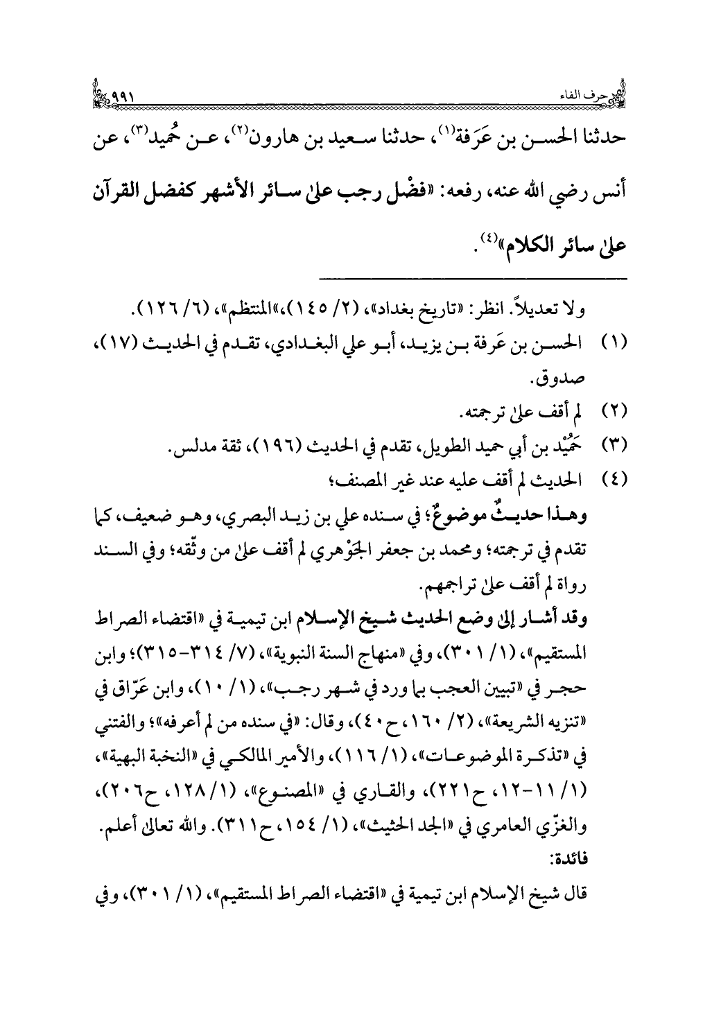 حدثنا الحسن بن عَرَفة (¬١)، حدثنا سعيد بن هارون (¬٢)، عن حُميد (¬٣)، عن أنس رضي الله عنه، رفعه: "فضْل رجب على سائر الأشهر كفضل القرآن على سائر الكلام" (¬٤).