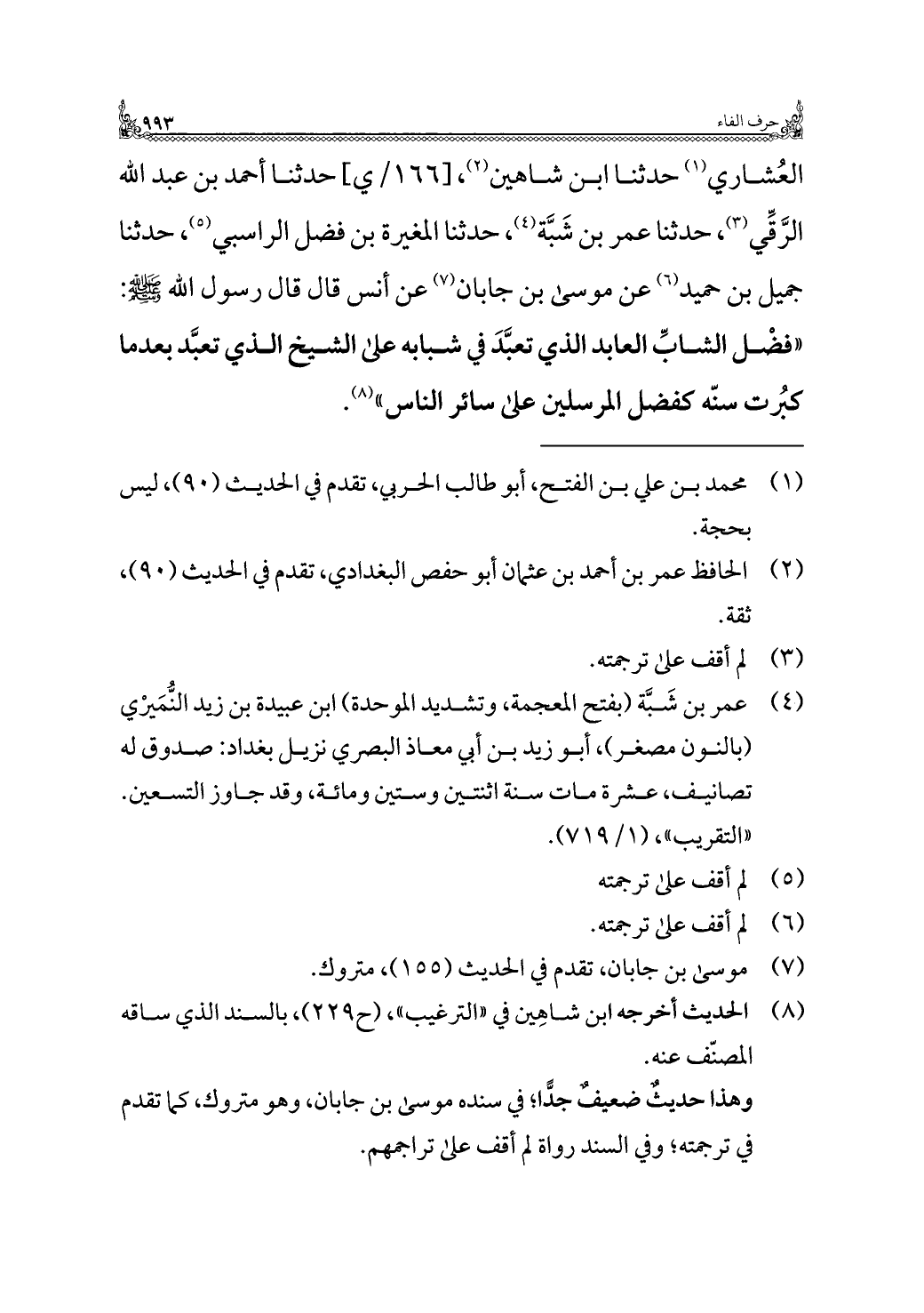 العُشاري (¬١) حدثنا ابن شاهين (¬٢)، حدثنا أحمد بن عبد الله الرَّقِّي (¬٣)، حدثنا عمر بن شَبَّة (¬٤)، حدثنا المغيرة بن فضل الراسبي (¬٥)، حدثنا جميل بن حميد (¬٦) عن موسى بن جابان (¬٧) عن أنس قال قال رسول الله -صلى الله عليه وسلم-: "فضْل الشابِّ العابد الذي تعبَّدَ في شبابه على الشيخ الذي تعبَّد بعدما كبُرت سنّه كفضل المرسلين على سائر الناس" (¬٨).