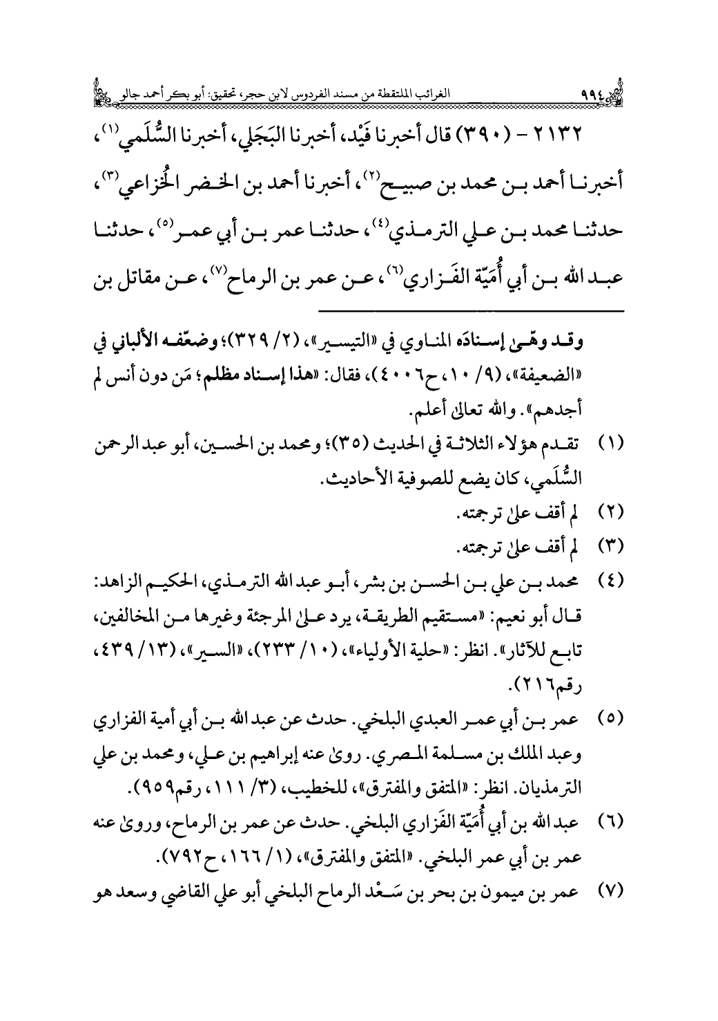 ٢١٣٢ - (٣٩٠) قال أخبرنا فَيْد، أخبرنا البَجَلي، أخبرنا السُّلَمي (¬١)، أخبرنا أحمد بن محمد بن صبيح (¬٢)، أخبرنا أحمد بن الخضر الخُزاعي (¬٣)، حدثنا محمد بن علي الترمذي (¬٤)، حدثنا عمر بن أبي عمر (¬٥)، حدثنا عبد الله بن أبي أُمَيّة الفَزاري (¬٦)، عن عمر بن الرماح (¬٧)، عن مقاتل بن