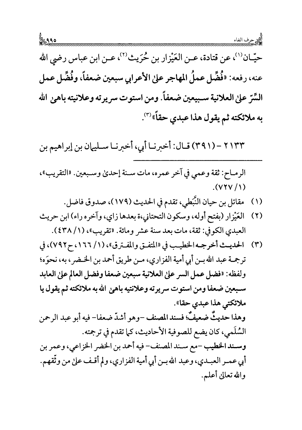 حيّان (¬١)، عن قتادة، عن العَيْزار بن حُرَيث (¬٢)، عن ابن عباس رضي الله عنه، رفعه: "فُضِّل عملُ المهاجر على الأعرابي سبعين ضعفًا، وفُضِّل عمل السِّرّ على العلانية سبيعين. ضعفًا. ومن استوت سريرته وعلانيته باهى الله به ملائكته ثم يقول هذا عبدي حقًا" (¬٣).