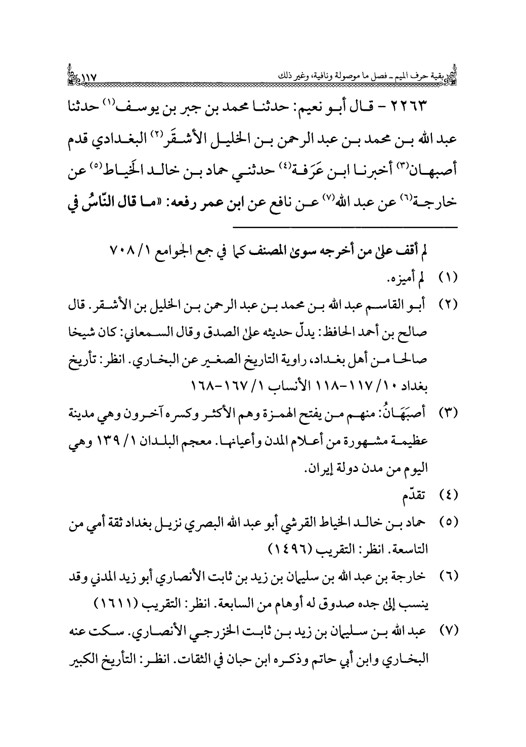 ٢٢٦٣ - قال أبو نعيم: حدثنا محمد بن جبر بن يوسف (¬١) حدثنا عبد الله بن محمد بن عبد الرحمن بن الخليل الأشقَر (¬٢) البغدادي قدم أصبهان (¬٣) أخبرنا ابن عَرَفة (¬٤) حدثني حماد بن خالد الخَياط (¬٥) عن خارجة (¬٦) عن عبد الله (¬٧) عن نافع عن ابن عمر رفعه: "ما قال النّاسُ في