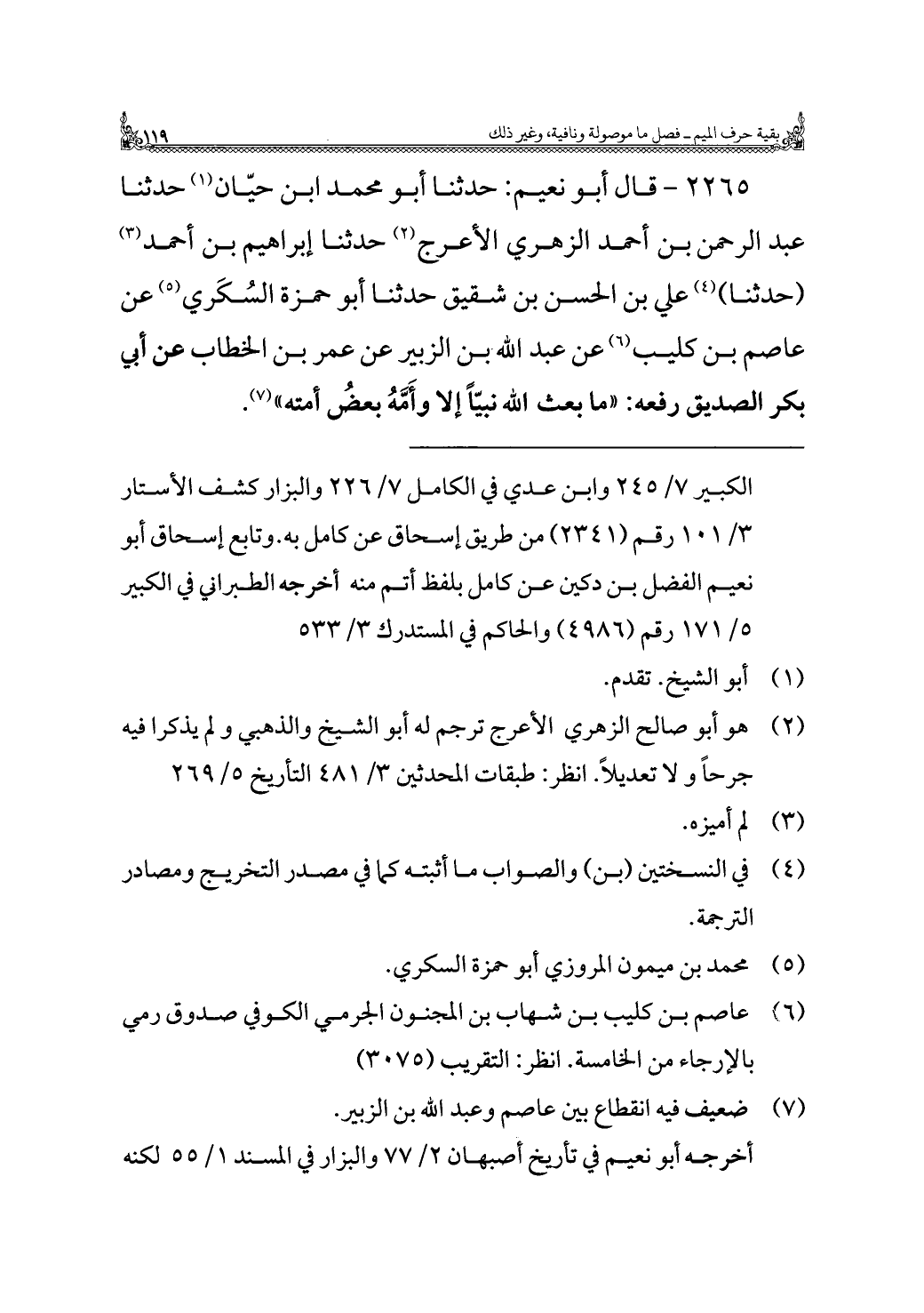 ٢٢٦٥ - قال أبو نعيم: حدثنا أبو محمد ابن حيّان (¬١) حدثنا عبد الرحمن بن أحمد الزهري الأعرج (¬٢) حدثنا إبراهيم بن أحمد (¬٣) (حدثنا) (¬٤) علي بن الحسن بن شقيق حدثنا أبو حمزة السُكَري (¬٥) عن عاصم بن كليب (¬٦) عن عبد الله بن الزبير عن عمر بن الخطاب عن أبي بكر الصديق رفعه: "ما بعث الله نبيًّا إلا وأَمَّهُ بعضُ أمته" (¬٧).