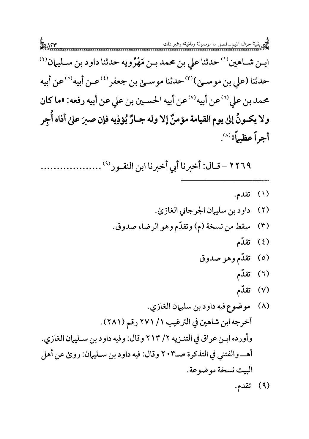 ابن شاهين (¬١) حدثنا علي بن محمد بن مَهْرُويه حدثنا داود بن سليمان (¬٢) حدثنا (علي بن موسى) (¬٣) حدثنا موسى بن جعفر (¬٤) عن أبيه (¬٥) عن أبيه محمد بن علي (¬٦) عن أبيه (¬٧) عن أبيه الحسين بن علي عن أبيه رفعه: "ما كان ولا يكونُ إلى يوم القيامة مؤمنٌ إلا وله جارٌ يُؤذِيه فإن صبرَ على أذاه أُجِر أجرًا عظيمًا" (¬٨).
