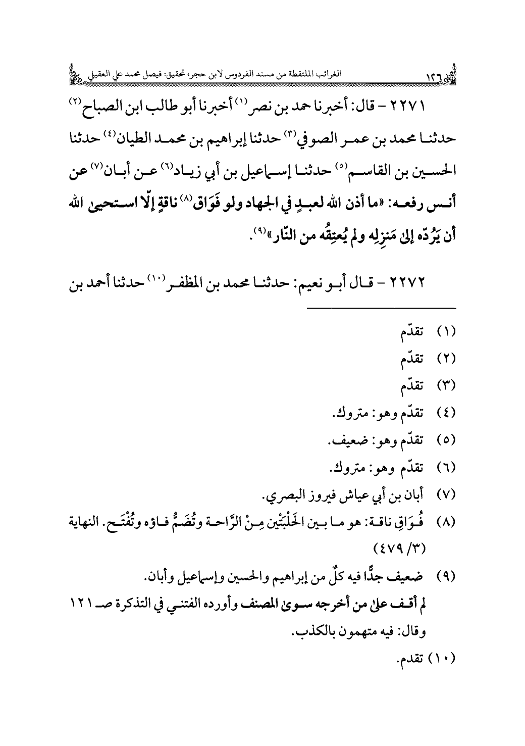 ٢٢٧١ - قال: أخبرنا حمد بن نصر (¬١) أخبرنا أبو طالب ابن الصباح (¬٢) حدثنا محمد بن عمر الصوفي (¬٣) حدثنا إبراهيم بن محمد الطيان (¬٤) حدثنا الحسين بن القاسم (¬٥) حدثنا إسماعيل بن أبي زياد (¬٦) عن أبان (¬٧) عن أنس رفعه: "ما أذن الله لعبدٍ في الجهاد ولو فَوَاق (¬٨) ناقةٍ إلا استحيى الله أن يَرُدّه إلى مَنزِلِه ولم يُعتِقُه من النّار" (¬٩).