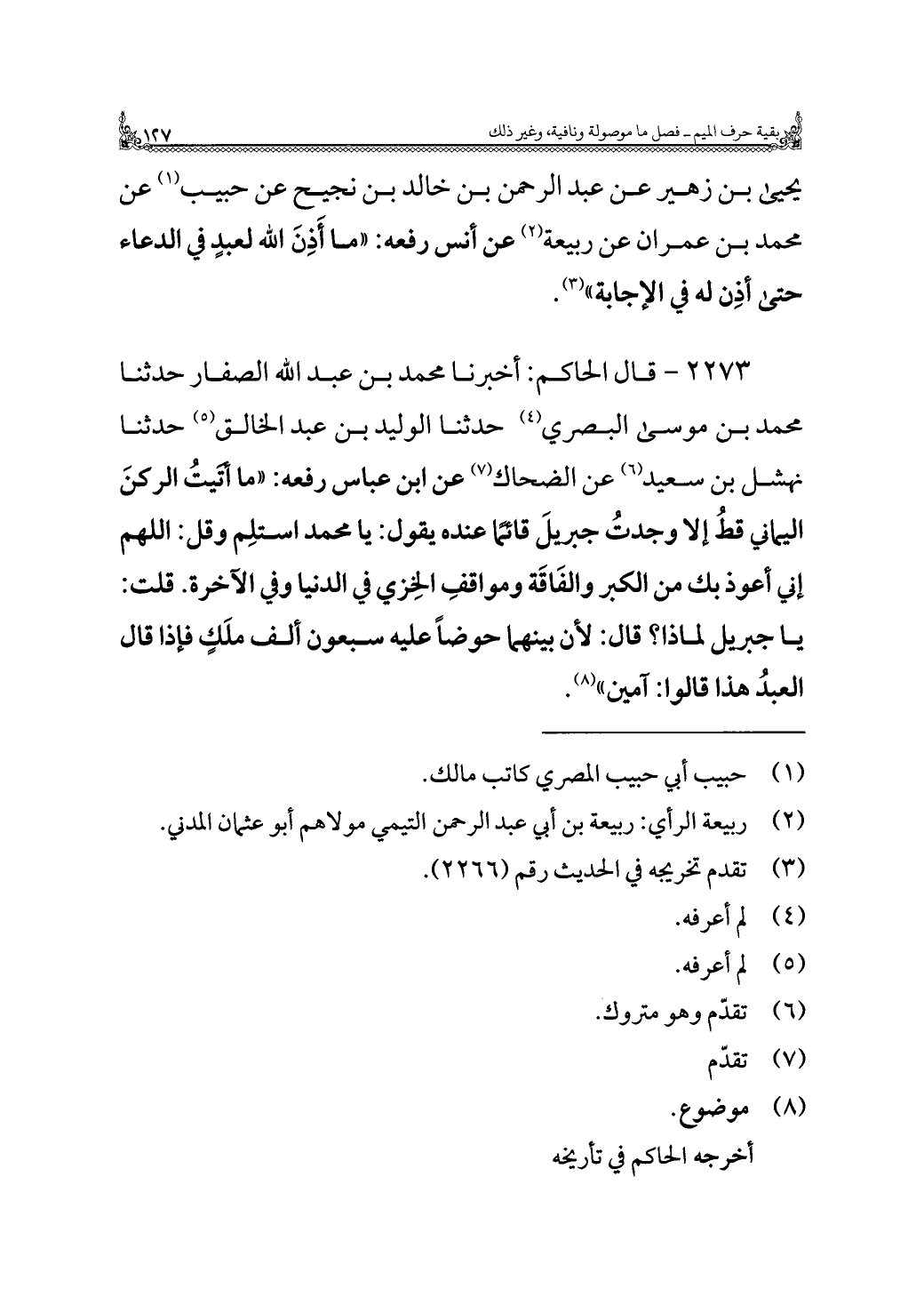٢٢٧٣ - قال الحاكم: أخبرنا محمد بن عبد الله الصفار حدثنا محمد بن موسى البصري (¬٤) حدثنا الوليد بن عبد الخالق (¬٥) حدثنا نهشل بن سعيد (¬٦) عن الضحاك (¬٧) عن ابن عباس رفعه: "ما أتَيتُ الركنَ اليماني قطُ إلا وجدتُ جبريلَ قائمًا عنده يقول: يا محمد استلِم وقل: اللهم إني أعوذ بك من الكبر والفَاقَة ومواقفِ الخِزي في الدنيا وفي الآخرة. قلت: يا جبريل لماذا؟ قال: لأن بينهما حوضًا عليه سبعون ألف ملَكٍ فإذا قال العبدُ هذا قالوا: آمين" (¬٨).