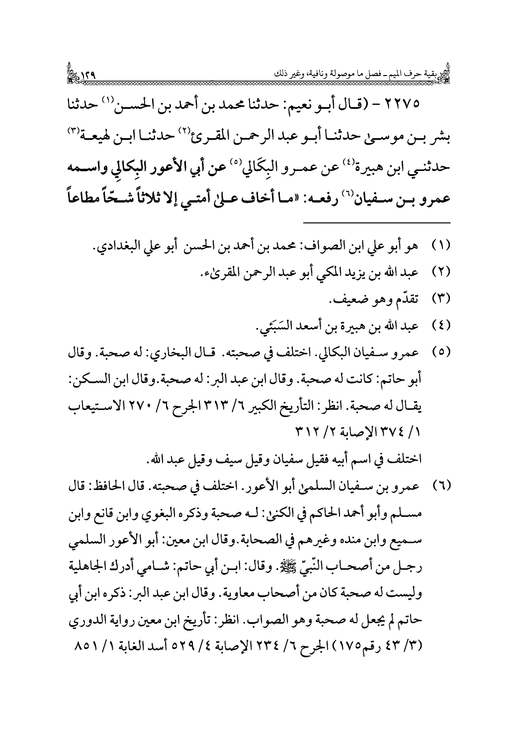 ٢٢٧٥ - (قال أبو نعيم: حدثنا محمد بن أحمد بن الحسن (¬١) حدثنا بشر بن موسى حدثنا أبو عبد الرحمن المقرئ (¬٢) حدثنا ابن لهيعة (¬٣) حدثني ابن هبيرة (¬٤) عن عمرو البِكَالي (¬٥) عن أبي الأعور البِكالِي واسمه عمرو بن سفيان (¬٦) رفعه: "ما أخاف على أمتي إلا ثلاثًا شحًّا مطاعًا