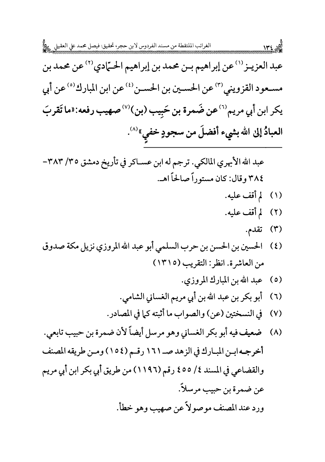 عبد العزيز (¬١) عن إبراهيم بن محمد بن إبراهيم الحمّادي (¬٢) عن محمد بن مسعود القزويني (¬٣) عن الحسين بن الحسن (¬٤) عن ابن المبارك (¬٥) عن أبي يكر ابن أبي مريم (¬٦) عن ضَمرة بن حَبِيب (بن) (¬٧) صهيب رفعه: "ما تَقربَ العبادُ إلى الله بشيء أفضلَ من سجوب خفيٍّ" (¬٨).