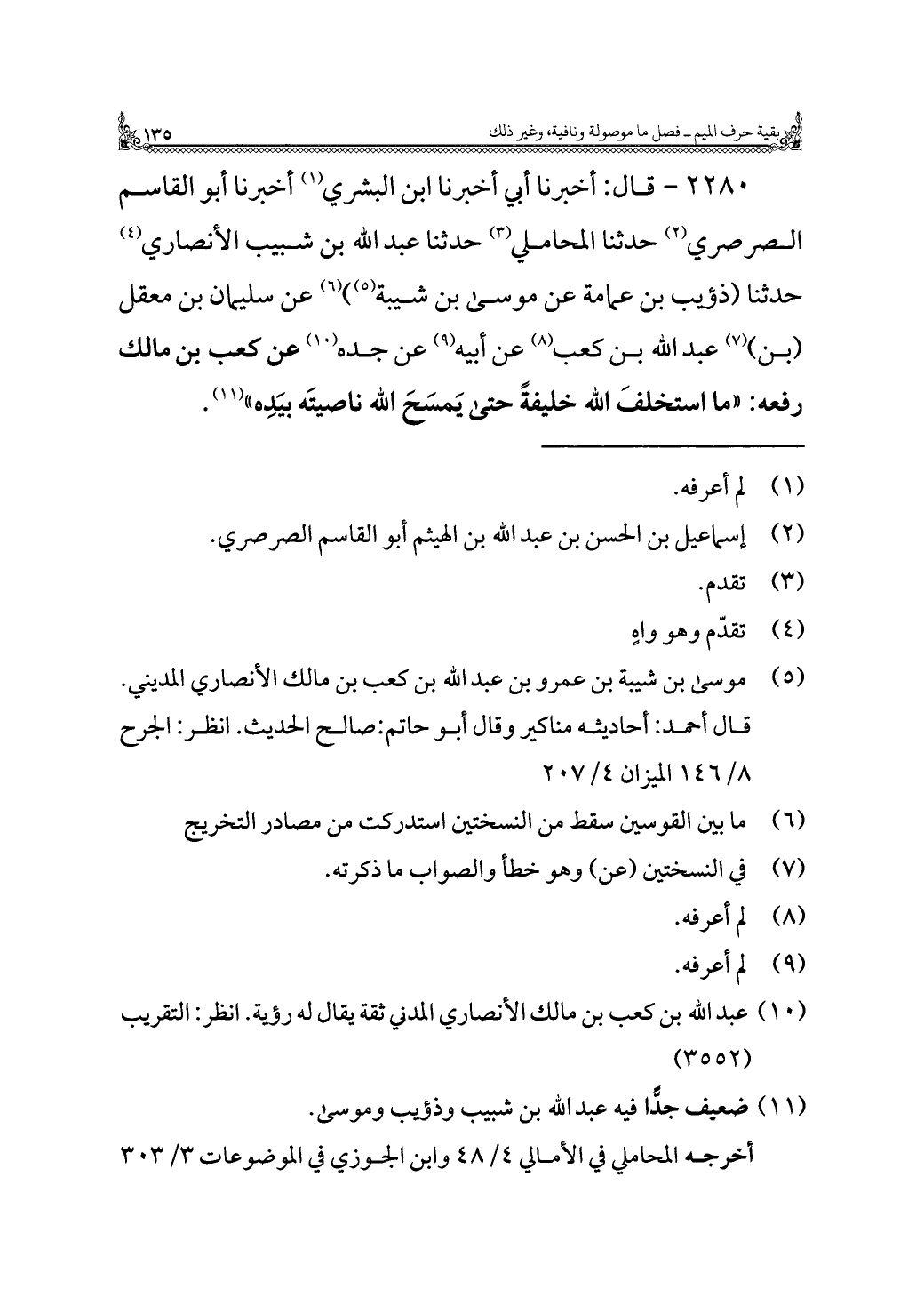٢٢٨٠ - قال: أخبرنا أبي أخبرنا ابن البشري (¬١) أخبرنا أبو القاسم الصرصري (¬٢) حدثنا المحاملي (¬٣) حدثنا عبد الله بن شبيب الأنصاري (¬٤) حدثنا (ذؤيب بن عمامة عن موسى بن شيبة) (¬٥) (¬٦) عن سليمان بن معقل (بن) (¬٧) عبد الله بن كعب (¬٨) عن أبيه (¬٩) عن جده (¬١٠) عن كعب بن مالك رفعه: "ما استخلفَ الله خليفةً حتى يَمسَحَ الله ناصيتَه بيَدِه" (¬١١).