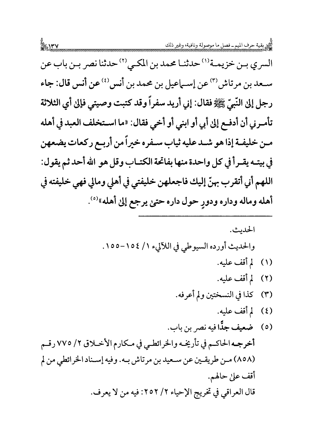 السري بن خزيمة (¬١) حدثنا محمد بن المكي (¬٢) حدثنا نصر بن باب عن سعد بن مرتاش (¬٣) عن إسماعيل بن محمد بن أنس (¬٤) عن أنس قال: جاء رجل إلى النّبيّ -صلى الله عليه وسلم- فقال: إني أريد سفرًا وقد كتبت وصيتي فإلى أي الثلاثة تأمرني أن أدفع إلى أبي أو ابني أو أخي فقال: "ما استخلف العبد في أهله من خليفة إذا هو شد عليه ثياب سفره خيرًا من أربع ركعات يضعهن في بيته يقرأ في كلل واحدة منها بفاتحة الكتاب وقل هو الله أحد ثم يقول: اللهم أني أتقرب بهنّ إليك فاجعلهن خليفتي في أهلي ومالي فهي خليفته في أهله وماله وداره ودورٍ حول داره حتى يرجع إلى أهله" (¬٥).