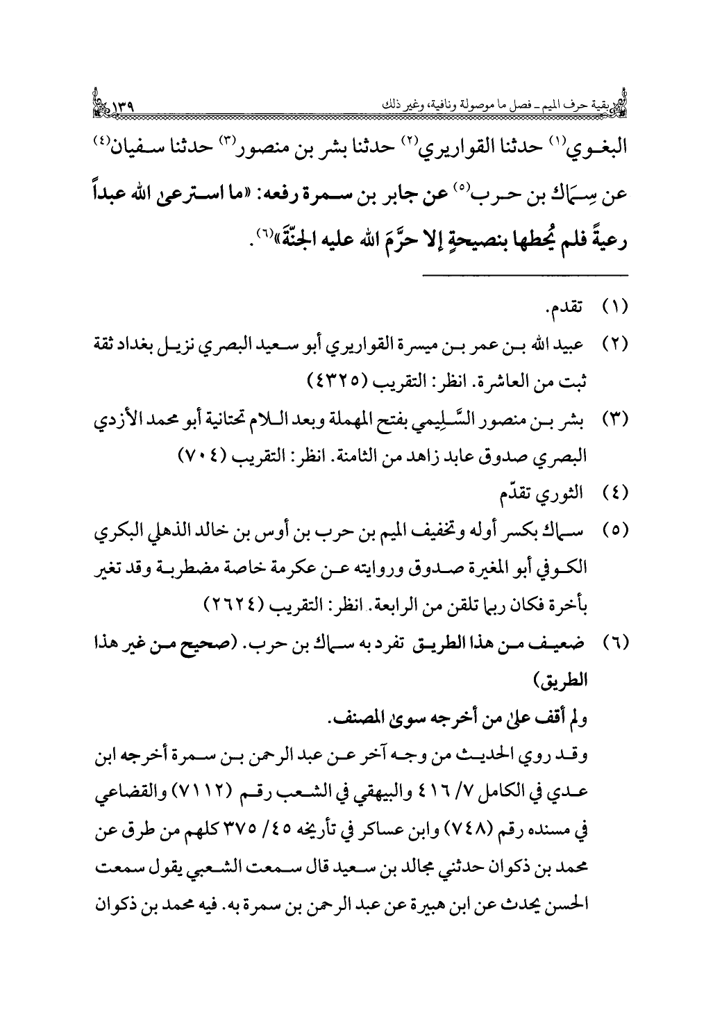 البغوي (¬١) حدثنا القواريري (¬٢) حدثنا بشر بن منصور (¬٣) حدثنا سفيان (¬٤) عن سِمَاك بن حرب (¬٥) عن جابر بن سمرة رفعه: "ما استرعى الله عبدًا رعيةً فلم يُحطها بنصيحةٍ إلا حرَّمَ الله عليه الجنّةَ" (¬٦).