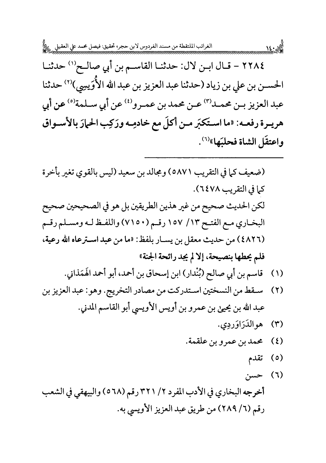 ٢٢٨٤ - قال ابن لال: حدثنا القاسم بن أبي صالح (¬١) حدثنا الحسن بن علي بن زياد (حدثنا عبد العزيز بن عبد الله الأُوَيسِي) (¬٢) حدثنا عبد العزيز بن محمد (¬٣) عن محمد بن عمرو (¬٤) عن أبي سلمة (¬٥) عن أبي هريرة رفعه: "ما استكبَر من أكلَ مع خادمِه ورَكب الحمارَ بالأسواق واعتقَل الشاة فحلبَها" (¬٦).