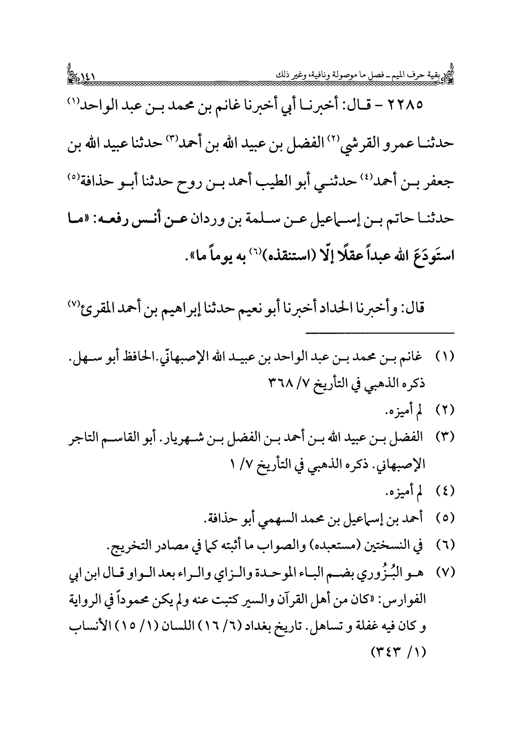 ٢٢٨٥ - قال: أخبرنا أبي أخبرنا غانم بن محمد بن عبد الواحد (¬١) حدثنا عمرو القرشي (¬٢) الفضل بن عبيد الله بن أحمد (¬٣) حدثنا عبيد الله بن جعفر بن أحمد (¬٤) حدثني أبو الطيب أحمد بن روح حدثنا أبو حذافة (¬٥) حدثنا حاتم بن إسماعيل عن سلمة بن وردان عن أنس رفعه: "ما استَودع الله عبدًا عقلًا إلّا (استنقذه) (¬٦) به يومًا ما".