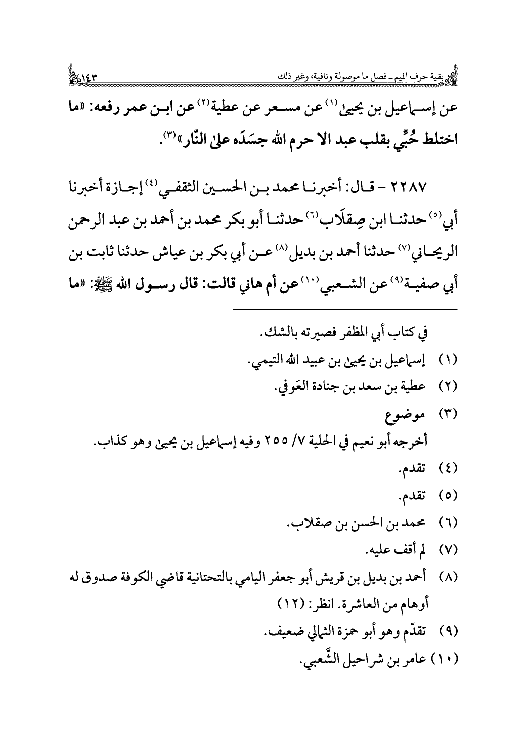 ٢٢٨٧ - قال: أخبرنا محمد بن الحسين الثقفي (¬٤) إجازة أخبرنا أبي (¬٥) حدثنا ابن صِقلَاب (¬٦) حدثنا أبو بكر محمد بن أحمد بن عبد الرحمن الريحاني (¬٧) حدثنا أحمد بن بديل (¬٨) عن أبي بكر بن عياش حدثنا ثابت بن أبي صفية (¬٩) عن الشعبي (¬١٠) عن أم هاني قالت: قال رسول الله -صلى الله عليه وسلم-: "ما