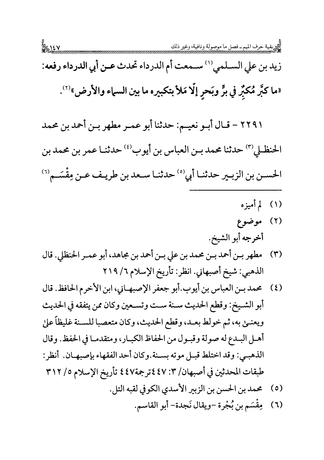 زيد بن علي السلمي (¬١) سمعت أم الدرداء تحدث عن أبي الدرداء رفعه: "ما كبَّر مُكِبرٌ في برٍّ وبَحرٍ إلّا مَلأ بتكبيره ما بين السماء والأرض" (¬٢).