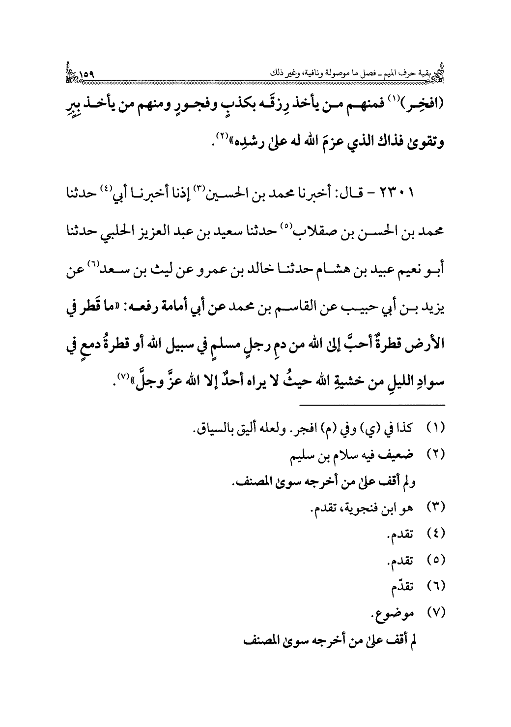 ٢٣٠١ - قال: أخبرنا محمد بن الحسين (¬٣) إذنا أخبرنا أبي (¬٤) حدثنا محمد بن الحسن بن صقلاب (¬٥) حدثنا سعيد بن عبد العزيز الحلبي حدثنا أبو نعيم عبيد بن هشام حدثنا خالد بن عمرو عن ليث بن سعد (¬٦) عن يزيد بن أبي حبيب عن القاسم بن محمد عن أبي أمامة رفعه: "ما قَطر في الأرض قطرةٌ أحبَّ إلى الله من دمِ رجلٍ مسلمٍ في سبيل الله أو قطرةُ دمعٍ في سوادِ الليلِ من خشيةِ الله حيثُ لا يراه أحدٌ إلا الله عزَّ وجلَّ" (¬٧).