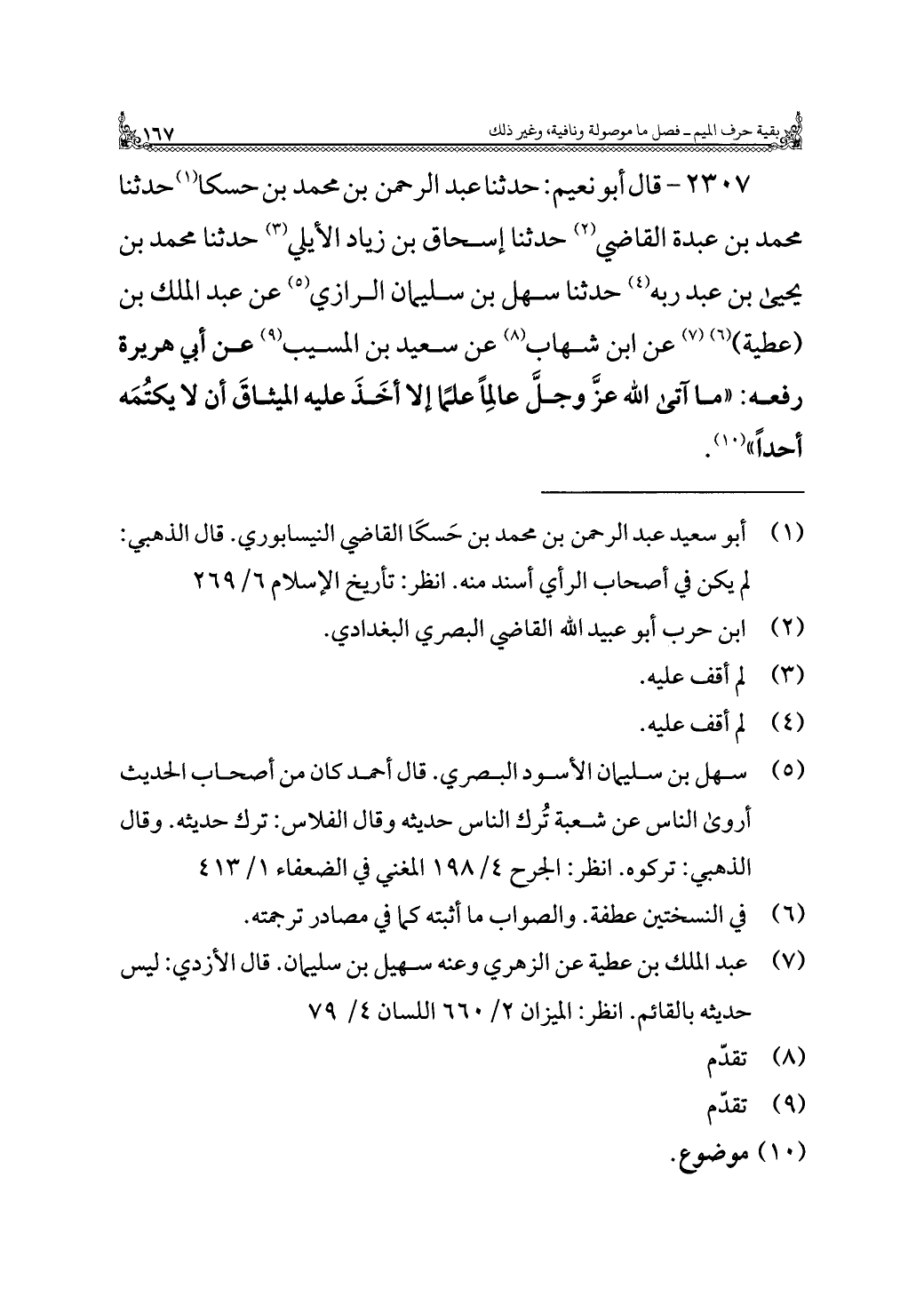 ٢٣٠٧ - قال أبو نعيم: حدثنا عبد الرحمن بن محمد بن حسكا (¬١) حدثنا محمد بن عبدة القاضي (¬٢) حدثنا إسحاق بن زياد الأيلي (¬٣) حدثنا محمد بن يحيى بن عبد ربه (¬٤) حدثنا سهل بن سليمان الرازي (¬٥) عن عبد الملك بن (عطية) (¬٦) (¬٧) عن ابن شهاب (¬٨) عن سعيد بن المسيب (¬٩) عن أبي هريرة رفعه: "ما آتى الله عزَّ وجلَّ عالمًا علمًا إلا أخَذَ عليه الميثاقَ أن لا يكتُمَه أحدًا" (¬١٠).