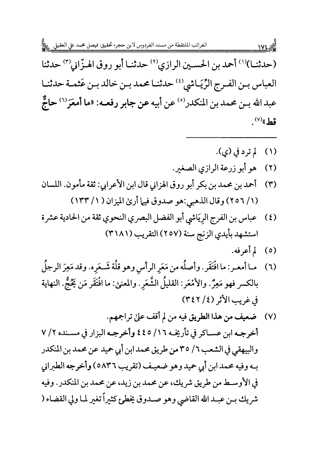 (حدثنا) (¬١) أحمد بن الحسين الرازي (¬٢) حدثنا أبو روق الهزّاني (¬٣) حدثنا العباس بن الفرج الرِّيَاشي (¬٤) حدثنا محمد بن خالد بن عَثمة حدثنا عبد الله بن محمد بن المنكدر (¬٥) عن أبيه عن جابر رفعه: "ما أمعَرَ (¬٦) حاجٌّ قط" (¬٧).