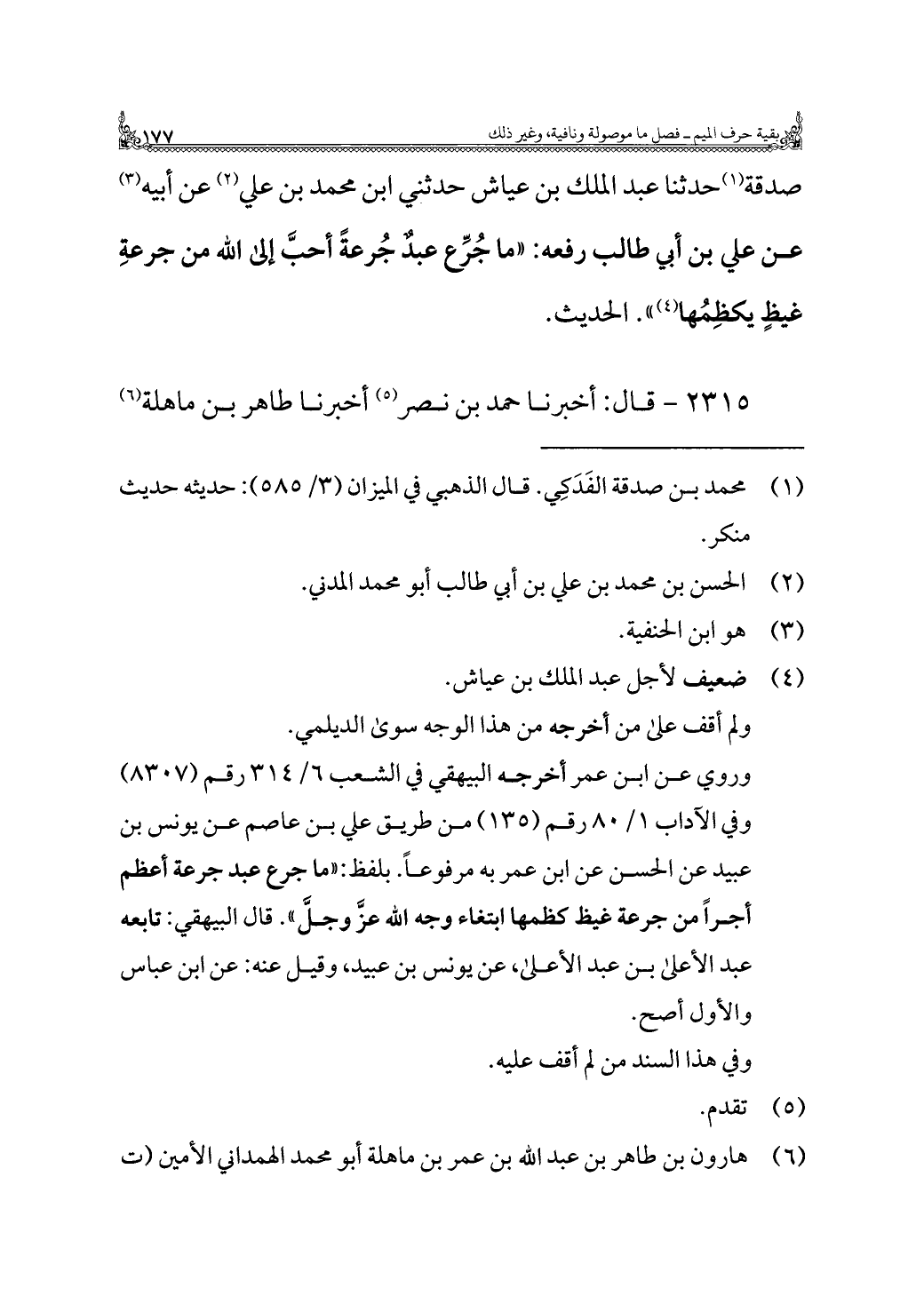 صدقة (¬١) حدثنا عبد الملك بن عياش حدثني ابن محمد بن علي (¬٢) عن أبيه (¬٣) عن علي بن أبي طالب رفعه: "ما جُرِّع عبدٌ جُرعةً أحبَّ إلى الله من جرعةِ غيظٍ يكظِمُها (¬٤) ". الحديث.