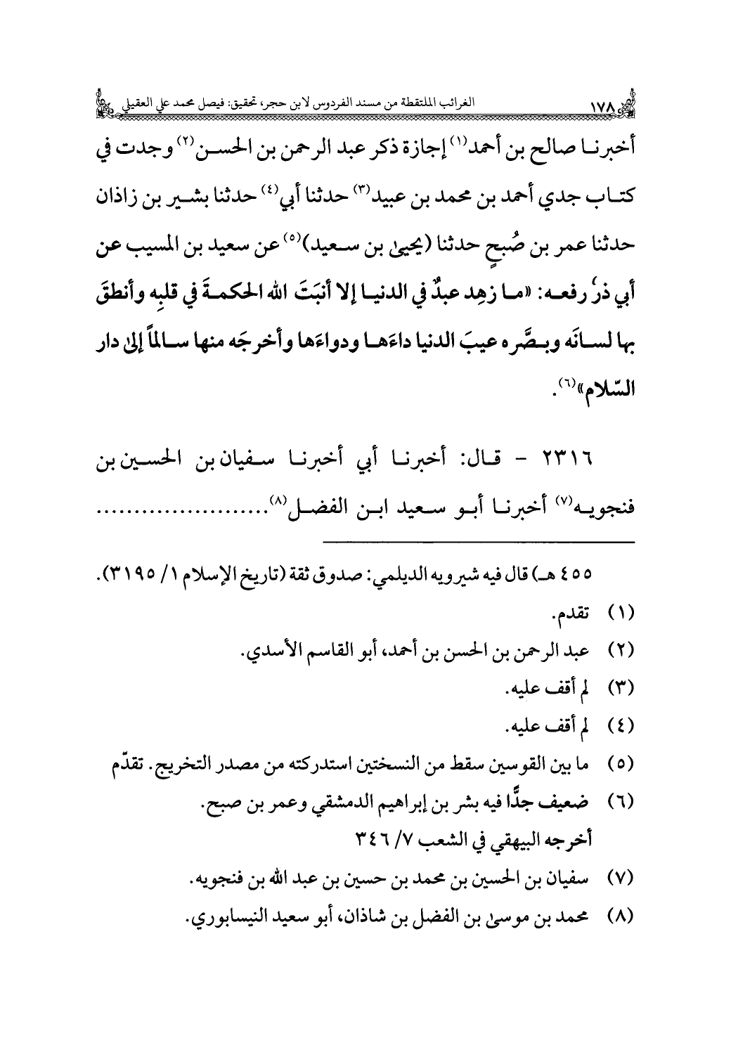 ٢٣١٦ - قال: أخبرنا أبي أخبرنا سفيان بن الحسين بن فنجويه (¬٧) أخبرنا أبو سعيد ابن الفضل (¬٨) .........