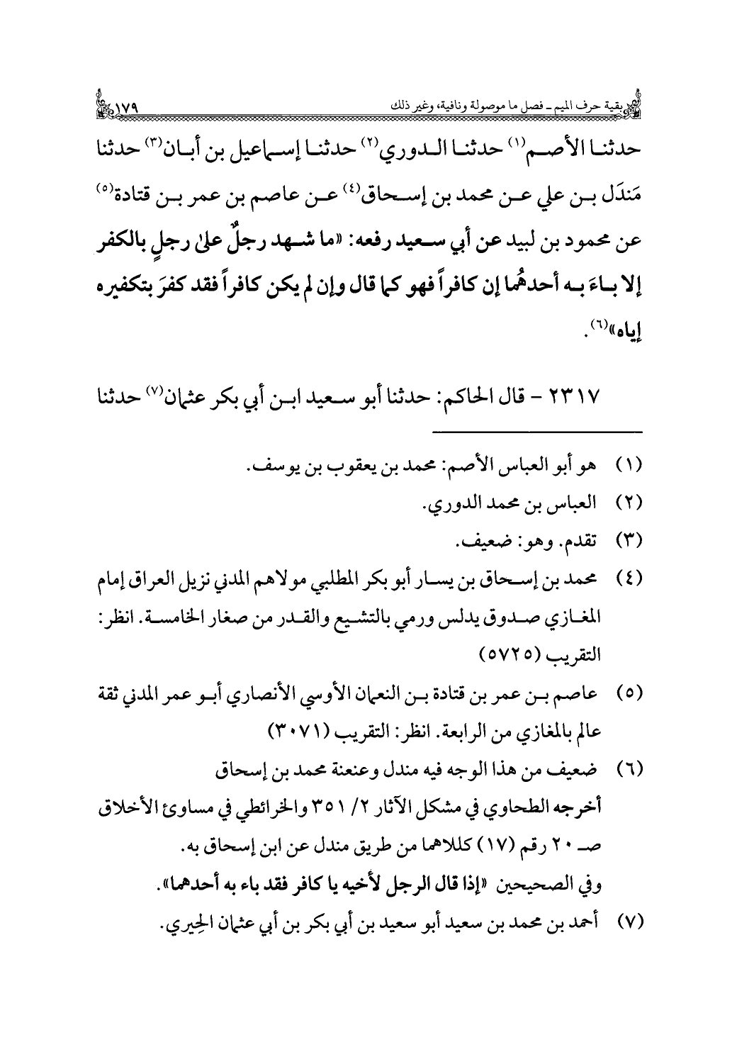 حدثنا الأصم (¬١) حدثنا الدوري (¬٢) حدثنا إسماعيل بن أبان (¬٣) حدثنا مَندَل بن علي عن محمد بن إسحاق (¬٤) عن عاصم بن عمر بن قتادة (¬٥) عن محمود بن لبيد عن أبي سعيد رفعه: "ما شهد رجلٌ على رجلٍ بالكفر إلا باءَ به أحدهُما إن كافرًا فهو كما قال وإن لم يكن كافرًا فقد كفرَ بتكفيره إياه" (¬٦).