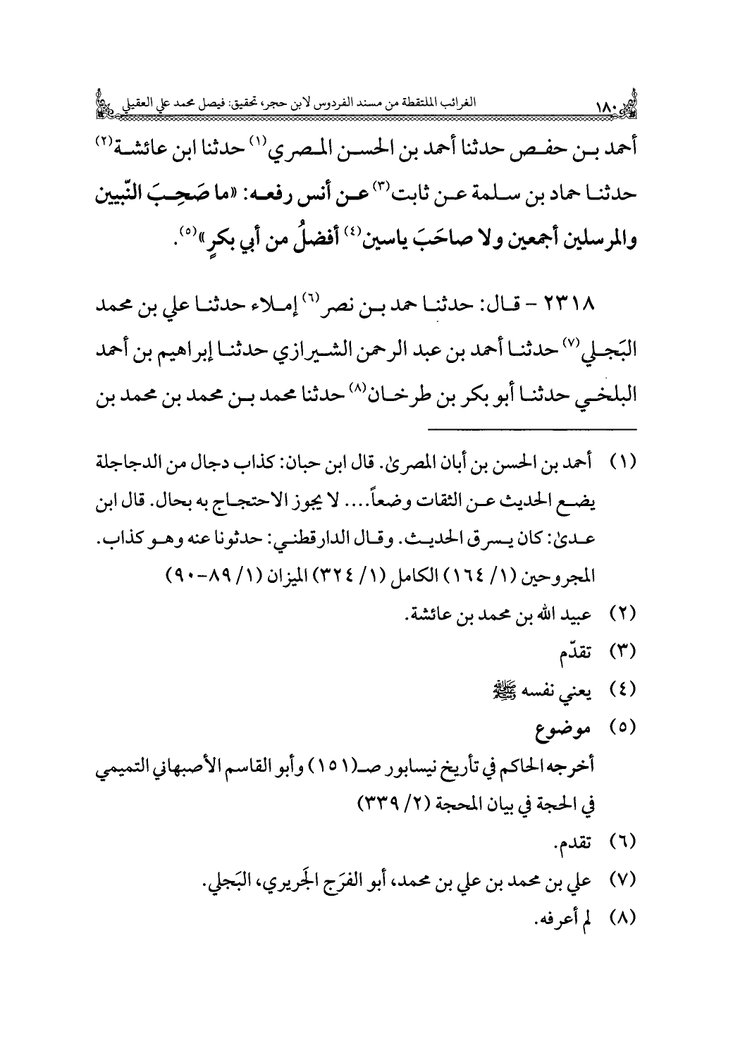 أحمد بن حفص حدثنا أحمد بن الحسن المصري (¬١) حدثنا ابن عائشة (¬٢) حدثنا حماد بن سلمة عن ثابت (¬٣) عن أنس رفعه: "ما صَحِبَ النّبيين والمرسلين أجمعين ولا صاحَبَ ياسين (¬٤) أفضلُ من أبي بكرٍ" (¬٥).