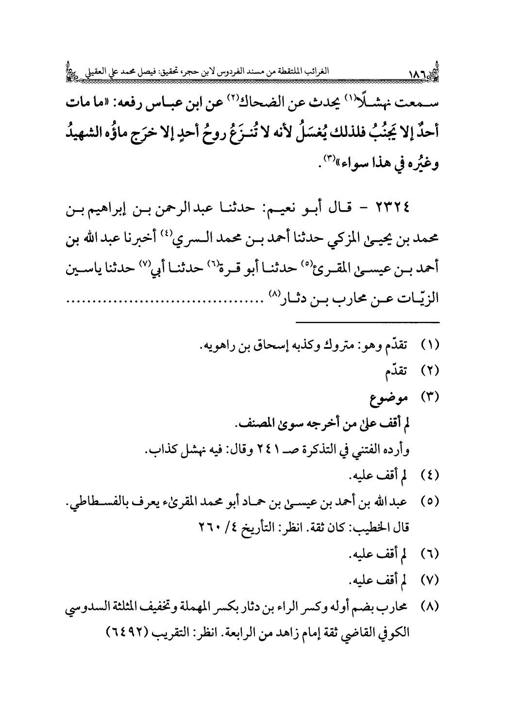 ٢٣٢٤ - قال أبو نعيم: حدثنا عبد الرحمن بن إبراهيم بن محمد بن يحيى المزكي حدثنا أحمد بن محمد السري (¬٤) أخبرنا عبد الله بن أحمد بن عيسى المقرئ (¬٥) حدثنا أبو قرة (¬٦) حدثنا أبي (¬٧) حدثنا ياسين الزيّات عن محارب بن دثار (¬٨) .......................
