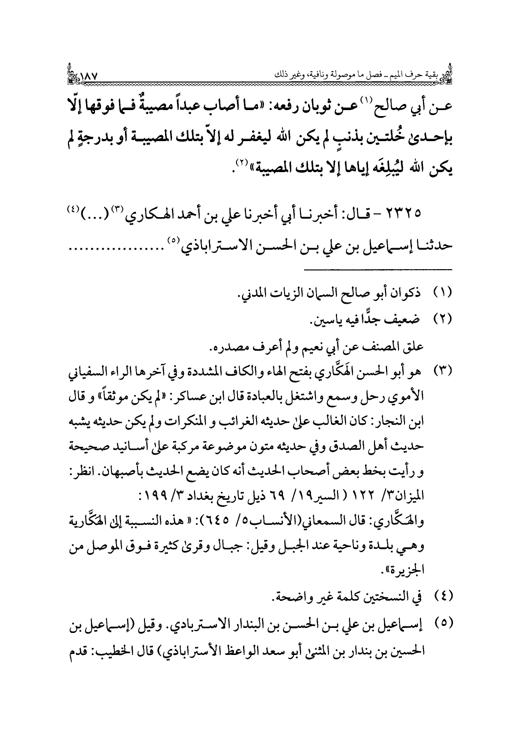 (¬٣) هو أبو الحسن الَهكَّاري بفتح الهاء والكاف المشددة وفي آخرها الراء السفياني الأموي رحل وسمع واشتغل بالعبادة قال ابن عساكر: "لم يكن موثقًا" وقال ابن النجار: كان الغالب على حديثه الغرائب والمنكرات ولم يكن حديثه يشبه حديث أهل الصدق وفي حديثه متون موضوعة مركبة على أسانيد صحيحة ورأيت بخط بعض أصحاب الحديث أنه كان يضع الحديث بأصبهان. انظر: الميزان ٣/ ١٢٢ (السير ١٩/ ٦٩ ذيل تاريخ بغداد ٣/ ١٩٩:
