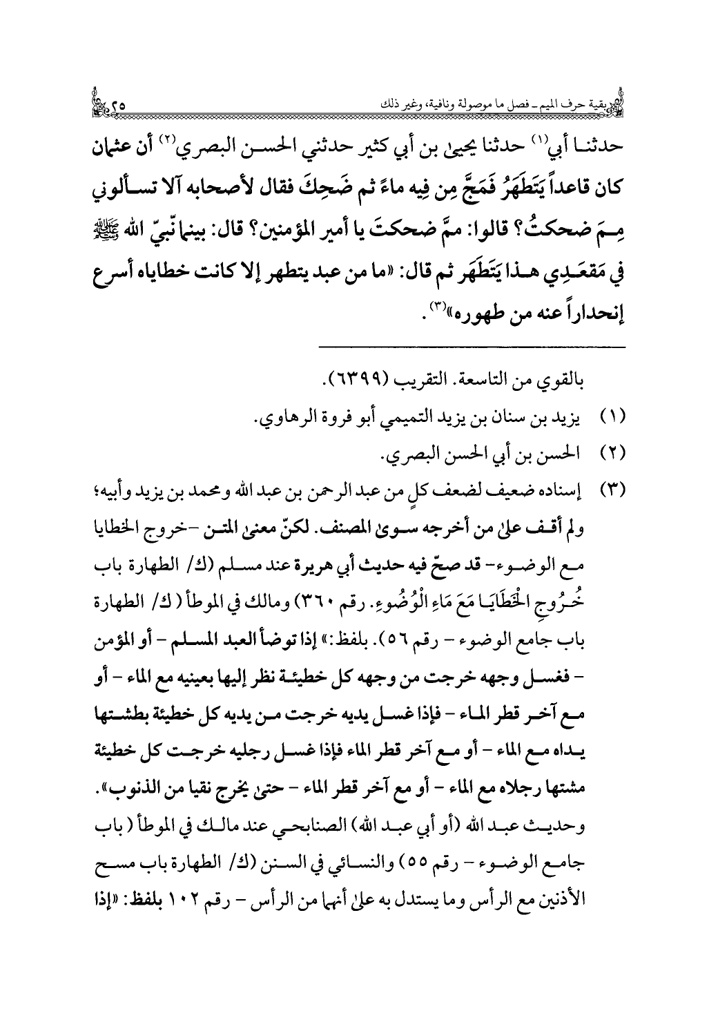 حدثنا أبي (¬١) حدثنا يحيى بن أبي كثير حدثني الحسن البصري (¬٢) أن عثمان كان قاعدًا يَتَطهرُ فَمَجَّ مِن فِيه ماءً ثم ضَحِكَ فقال لأصحابه آلا تسالوني مِمَ ضحكتُ؟ قالوا: ممَّ ضحكتَ يا أمير المؤمنين؟ قال: بينما نّبيّ الله -صلى الله عليه وسلم- في مَقعَدِي هذا يَتَطهر ثم قال: "ما من عبد يتطهر إلا كانت خطاياه أسرع إنحدارًا عنه من طهوره" (¬٣).