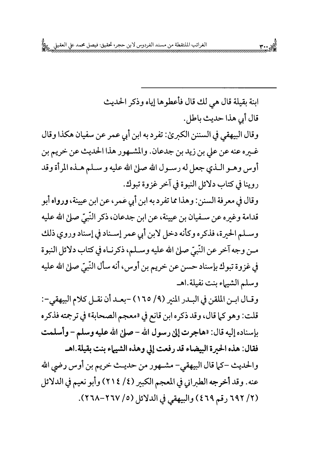 وقال في معرفة السنن: وهذا مما تفرد به ابن أبي عمر، عن ابن عيينة، ورواه أبو قدامة وغيره عن سفيان بن عيينة، عن ابن جدعان، ذكر النّبيّ صلى الله عليه وسلم الحيرة، فذكره وكأنه دخل لابن أبي عمر إسناد في إسناد وروي ذلك من وجه آخر عن النّبيّ صلى الله عليه وسلم، ذكرناه في كتاب دلائل النبوة في غزوة تبوك بإسناد حسن عن خريم بن أوس، أنه سأل النّبيّ صلى الله عليه وسلم الشيماء بنت نفيلة. اهـ