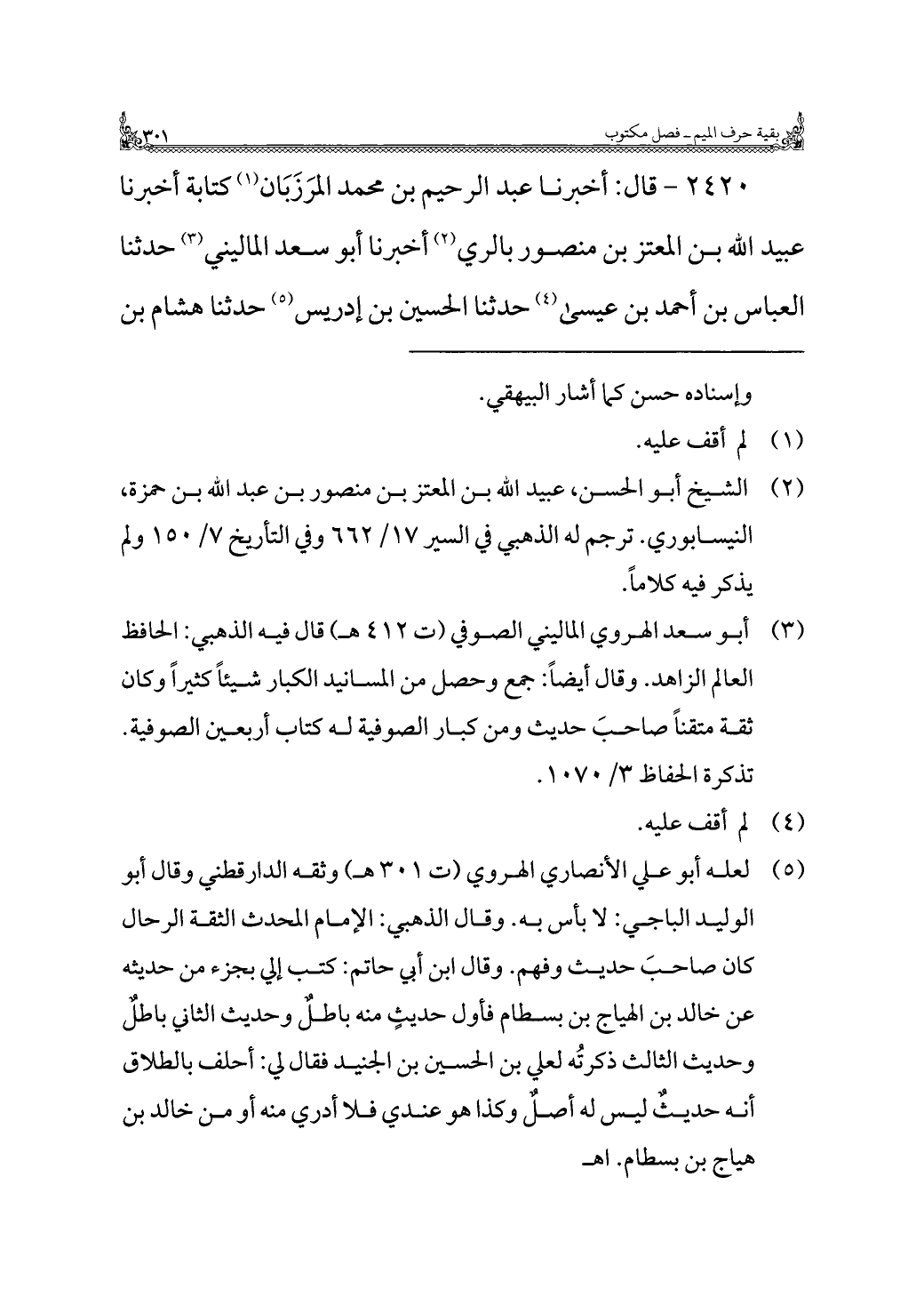 ٢٤٢٠ - قال: أخبرنا عبد الرحيم بن محمد المرَزَبَان (¬١) كتابة أخبرنا عبيد الله بن المعتز بن منصور بالري (¬٢) أخبرنا أبو سعد الماليني (¬٣) حدثنا العباس بن أحمد بن عيسى (¬٤) حدثنا الحسين بن إدريس (¬٥) حدثنا هشام بن