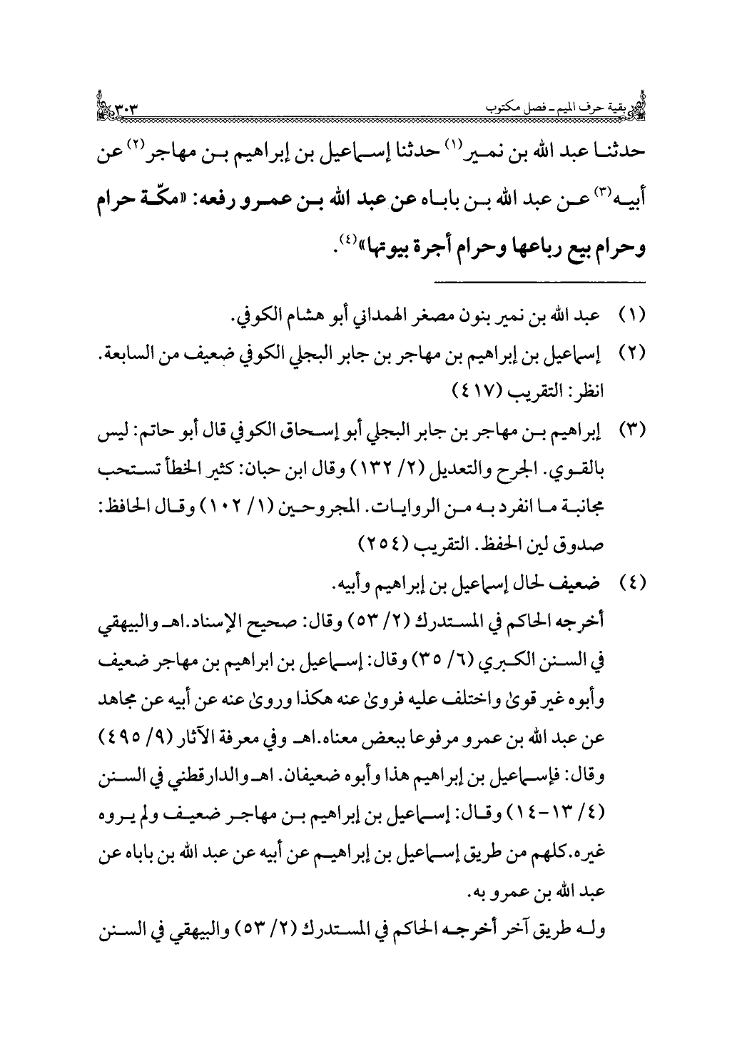 حدثنا عبد الله بن نمير (¬١) حدثنا إسماعيل بن إبراهيم بن مهاجر (¬٢) عن أبيه (¬٣) عن عبد الله بن باباه عن عبد الله بن عمرو رفعه: "مكّة حرام وحرام بيع رباعها وحرام أجرة بيوتها" (¬٤).