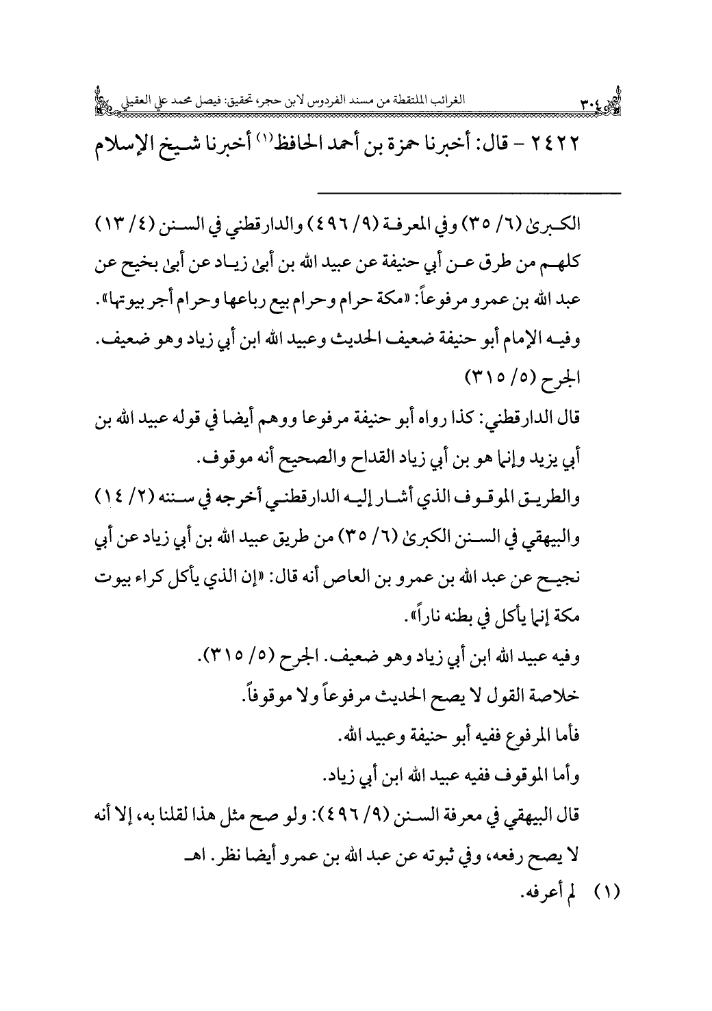 الكبرى (٦/ ٣٥) وفي المعرفة (٩/ ٤٩٦) والدارقطني في السنن (٤/ ١٣) كلهم من طرق عن أبي حنيفة عن عبيد الله بن أبى زياد عن أبى بخيح عن عبد الله بن عمرو مرفوعًا: "مكة حرام وحرام بيع رباعها وحرام أجر بيوتها". وفيه الإمام أبو حنيفة ضعيف الحديث وعبيد الله ابن أبي زياد وهو ضعيف. الجرح (٥/ ٣١٥).
