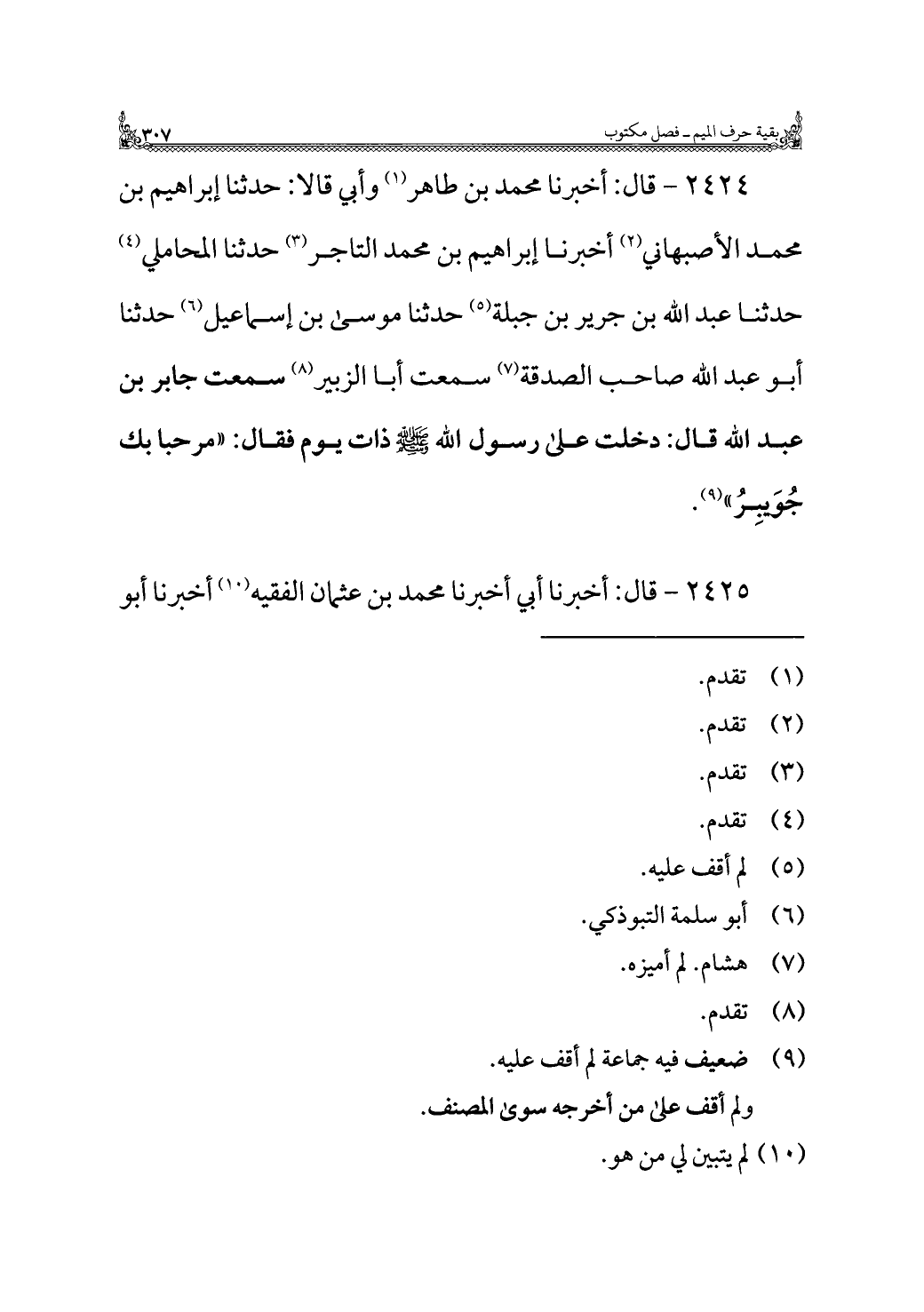٢٤٢٤ - قال: أخبرنا محمد بن طاهر (¬١) وأبي قالا: حدثنا إبراهيم بن محمد الأصبهاني (¬٢) أخبرنا إبراهيم بن محمد التاجر (¬٣) حدثنا المحاملي (¬٤) حدثنا عبد الله بن جرير بن جبلة (¬٥) حدثنا موسى بن إسماعيل (¬٦) حدثنا أبو عبد الله صاحب الصدقة (¬٧) سمعت أبا الزبير (¬٨) سمعت جابر بن عبد الله قال: دخلت على رسول الله -صلى الله عليه وسلم- ذات يوم فقال: "مرحبا بك جُوَيبِرُ" (¬٩).