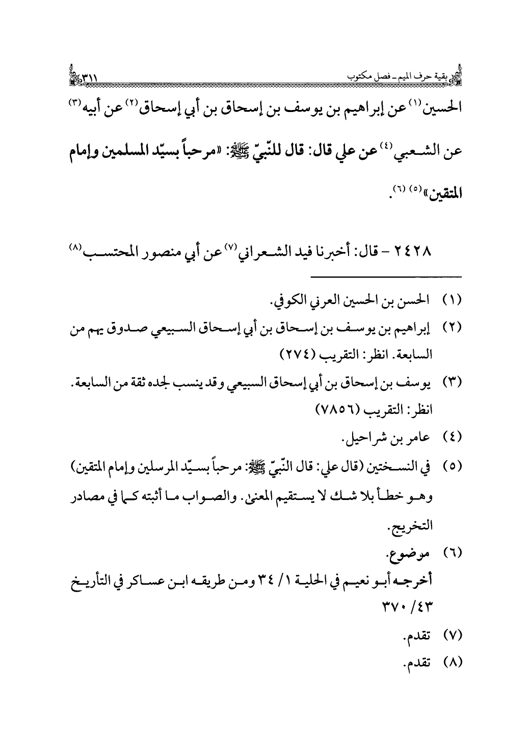 الحسين (¬١) عن إبراهيم بن يوسف بن إسحاق بن أبي إسحاق (¬٢) عن أبيه (¬٣) عن الشعبي (¬٤) عن علي قال: قال للنّبيّ -صَلَّى اللهُ عَلَيْهِ وَسَلَّمَ-: "مرحبًا بسيّد المسلمين وإمام المتقين" (¬٥) (¬٦).